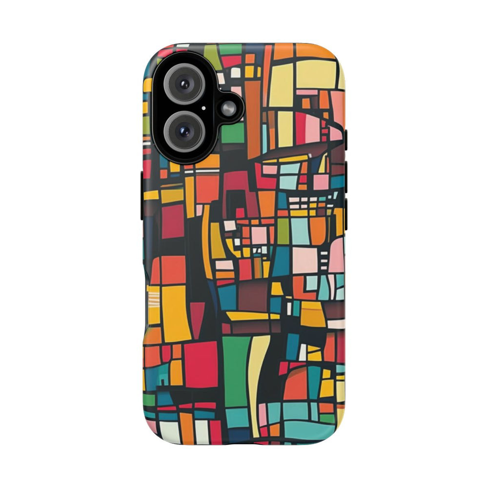 Dit hoesje heeft een opvallend abstract geometrisch patroon met talloze kleine rechthoeken en vierkanten in verschillende kleuren. De vormen zijn omlijnd met zwart, wat zorgt voor een glas-in-lood effect. Het kleurenpalet bestaat uit tinten rood, oranje, geel, groen, blauw en roze, die samen een levendig en gedetailleerd geheel vormen. Het hoesje is voorzien van een dubbele laag met een polycarbonaat buitenkant en TPU binnenzijde en is geschikt voor draadloos opladen.