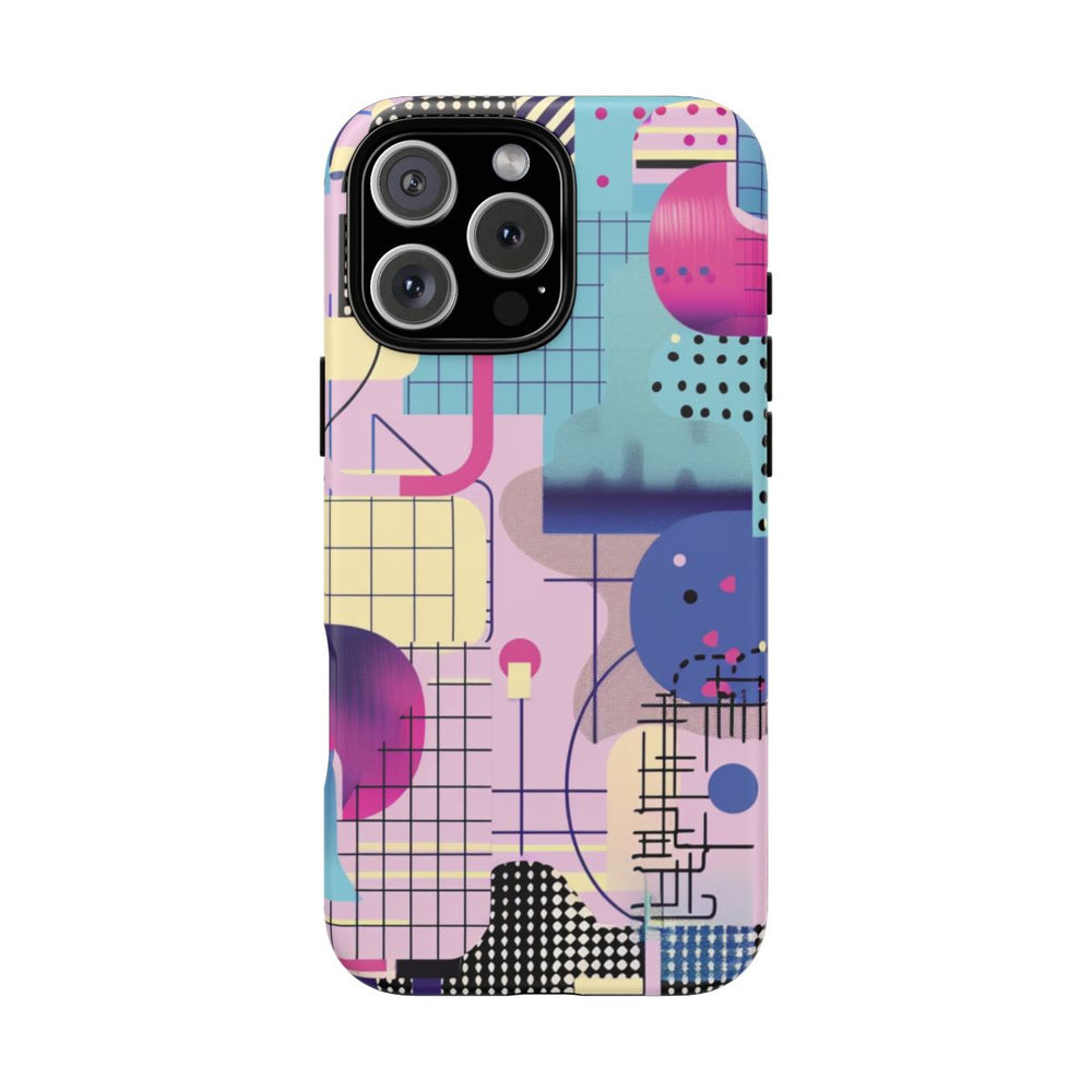 Dit hoesje heeft een levendig abstract geometrisch patroon met diverse vormen zoals cirkels, rasters, stippen en lijnen. De kleurencombinatie bestaat uit tinten blauw, roze, paars, zwart en crème, wat zorgt voor een dynamisch en opvallend geheel. Door de verschillende lagen, texturen en vormen krijgt het patroon extra diepte en karakter. Het ontwerp is bedrukt op een mat hoesje van polycarbonaat en TPU, dat bestaat uit twee lagen voor optimale bescherming en geschikt is voor draadloos opladen.