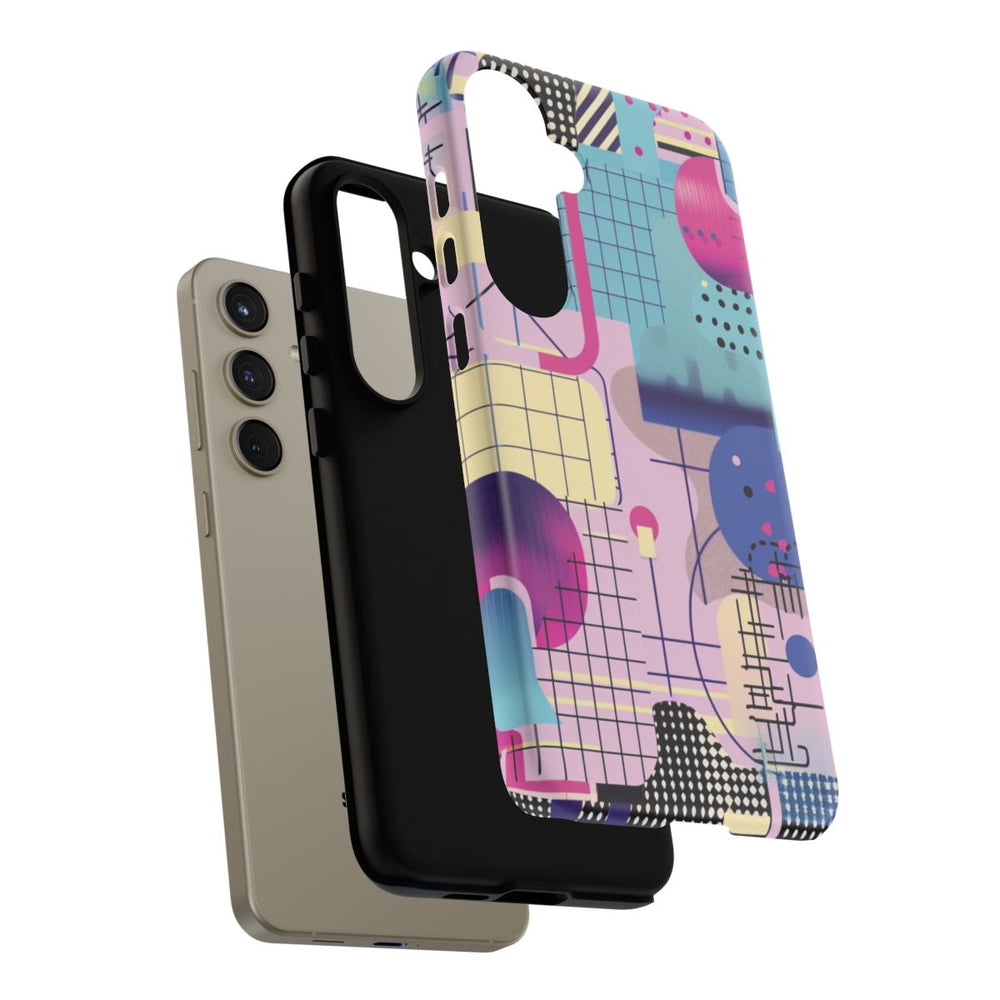 Dit hoesje heeft een levendig abstract geometrisch patroon met diverse vormen zoals cirkels, rasters, stippen en lijnen. De kleurencombinatie bestaat uit tinten blauw, roze, paars, zwart en crème, wat zorgt voor een dynamisch en opvallend geheel. Door de verschillende lagen, texturen en vormen krijgt het patroon extra diepte en karakter. Het ontwerp is bedrukt op een mat hoesje van polycarbonaat en TPU, dat bestaat uit twee lagen voor optimale bescherming en geschikt is voor draadloos opladen.