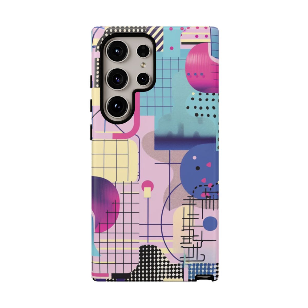 Dit hoesje heeft een levendig abstract geometrisch patroon met diverse vormen zoals cirkels, rasters, stippen en lijnen. De kleurencombinatie bestaat uit tinten blauw, roze, paars, zwart en crème, wat zorgt voor een dynamisch en opvallend geheel. Door de verschillende lagen, texturen en vormen krijgt het patroon extra diepte en karakter. Het ontwerp is bedrukt op een mat hoesje van polycarbonaat en TPU, dat bestaat uit twee lagen voor optimale bescherming en geschikt is voor draadloos opladen.