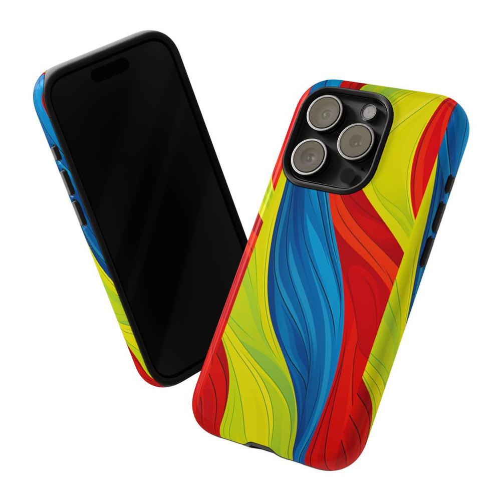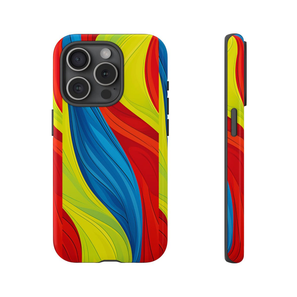 Dit telefoonhoesje heeft een levendig abstract golfpatroon met vloeiende lijnen in heldere tinten blauw, rood, geel en groen. De kleuren lopen soepel in elkaar over en worden subtiel geaccentueerd met dunne zwarte contouren, wat de beweging van de golven benadrukt. Dit patroon zorgt voor een dynamisch en energiek visueel effect. Het hoesje is glanzend afgewerkt en bestaat uit een stevige polycarbonaat buitenkant met een TPU binnenzijde. Dankzij deze dubbele laag biedt het optimale bescherming en is het geschikt voor draadloos opladen. Het ontwerp is bestand tegen weersinvloeden en behoudt langdurig zijn heldere uitstraling.