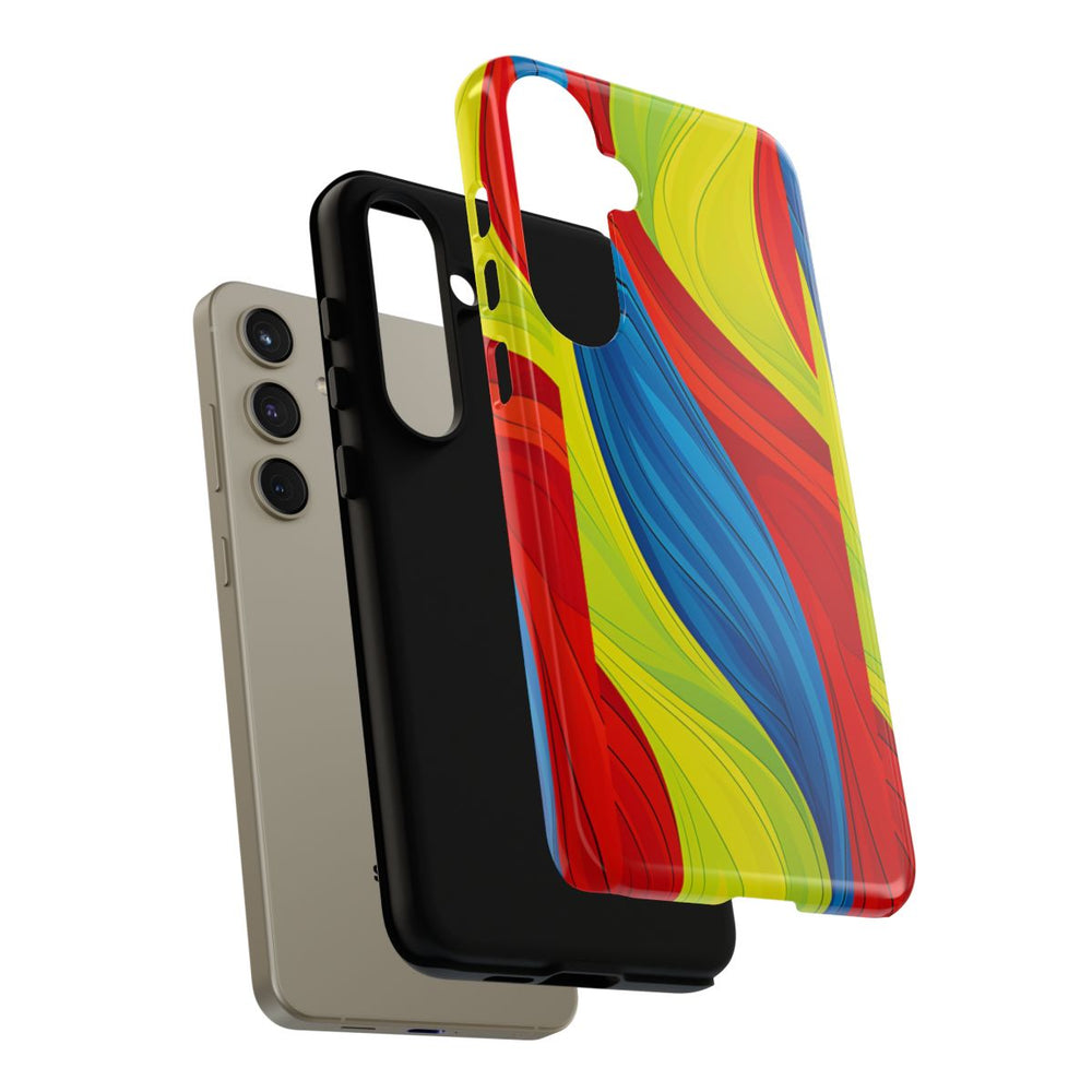 Dit telefoonhoesje heeft een levendig abstract golfpatroon met vloeiende lijnen in heldere tinten blauw, rood, geel en groen. De kleuren lopen soepel in elkaar over en worden subtiel geaccentueerd met dunne zwarte contouren, wat de beweging van de golven benadrukt. Dit patroon zorgt voor een dynamisch en energiek visueel effect. Het hoesje is glanzend afgewerkt en bestaat uit een stevige polycarbonaat buitenkant met een TPU binnenzijde. Dankzij deze dubbele laag biedt het optimale bescherming en is het geschikt voor draadloos opladen. Het ontwerp is bestand tegen weersinvloeden en behoudt langdurig zijn heldere uitstraling.