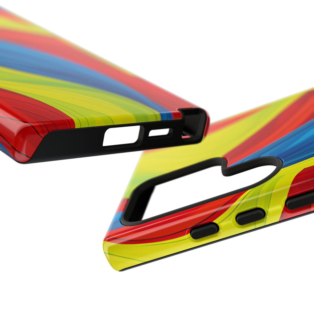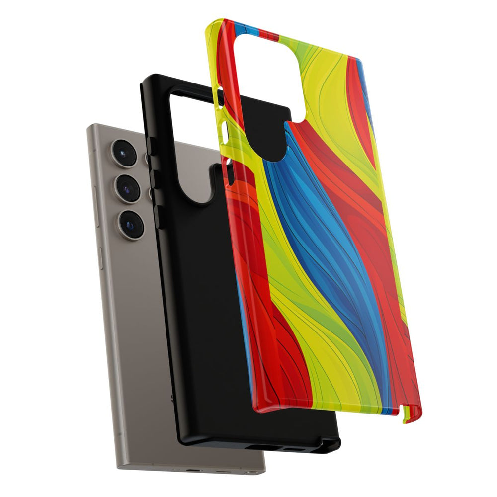 Dit telefoonhoesje heeft een levendig abstract golfpatroon met vloeiende lijnen in heldere tinten blauw, rood, geel en groen. De kleuren lopen soepel in elkaar over en worden subtiel geaccentueerd met dunne zwarte contouren, wat de beweging van de golven benadrukt. Dit patroon zorgt voor een dynamisch en energiek visueel effect. Het hoesje is glanzend afgewerkt en bestaat uit een stevige polycarbonaat buitenkant met een TPU binnenzijde. Dankzij deze dubbele laag biedt het optimale bescherming en is het geschikt voor draadloos opladen. Het ontwerp is bestand tegen weersinvloeden en behoudt langdurig zijn heldere uitstraling.