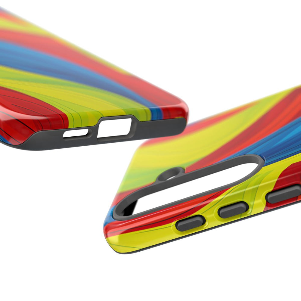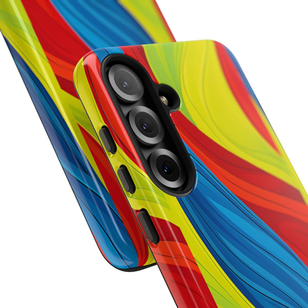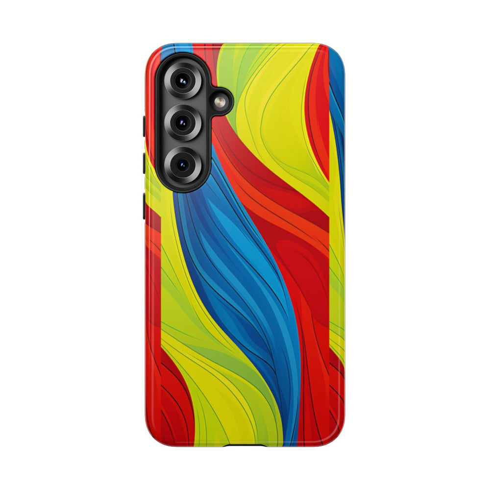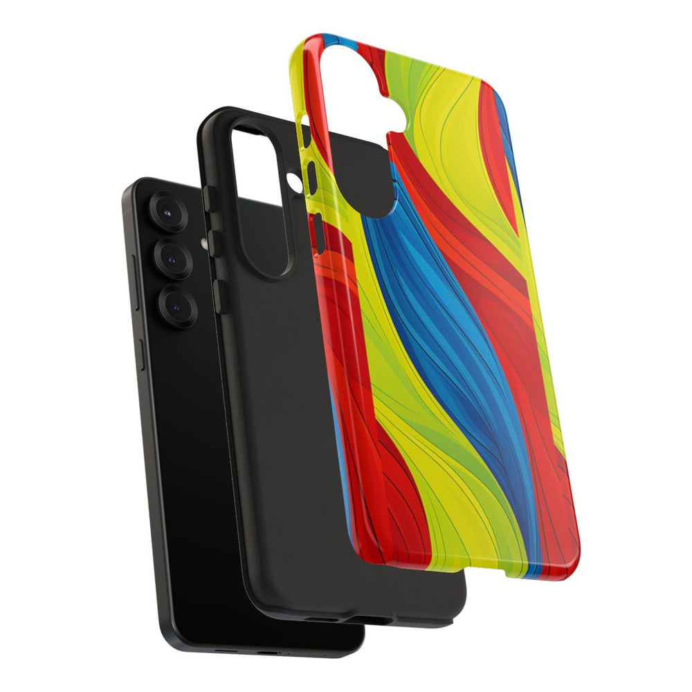 Dit telefoonhoesje heeft een levendig abstract golfpatroon met vloeiende lijnen in heldere tinten blauw, rood, geel en groen. De kleuren lopen soepel in elkaar over en worden subtiel geaccentueerd met dunne zwarte contouren, wat de beweging van de golven benadrukt. Dit patroon zorgt voor een dynamisch en energiek visueel effect. Het hoesje is glanzend afgewerkt en bestaat uit een stevige polycarbonaat buitenkant met een TPU binnenzijde. Dankzij deze dubbele laag biedt het optimale bescherming en is het geschikt voor draadloos opladen. Het ontwerp is bestand tegen weersinvloeden en behoudt langdurig zijn heldere uitstraling.