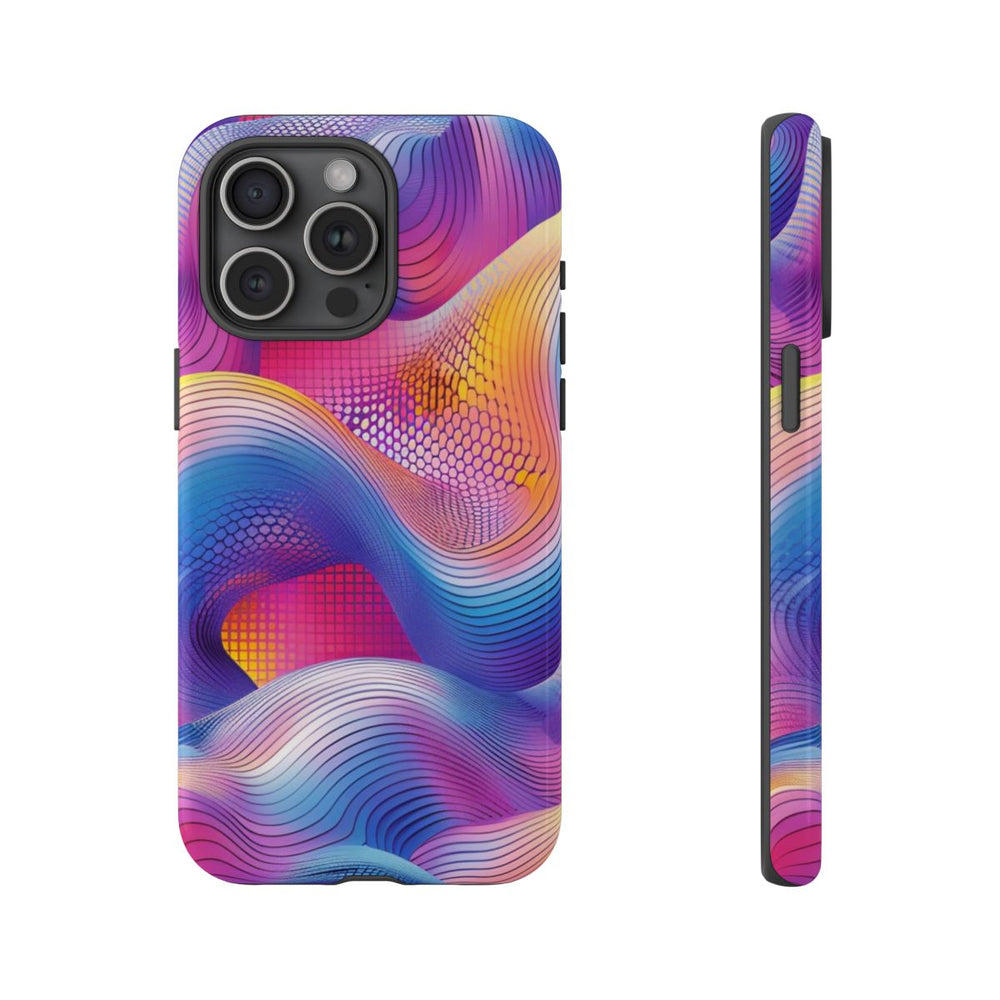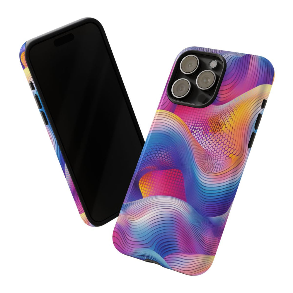 Dit telefoonhoesje heeft een abstract ontwerp met vloeiende, golvende vormen over een levendige achtergrond. Zachte kleurverlopen mengen roze, paars, blauw en geel tot een harmonieus geheel. Dunne zwarte lijnen volgen de golven en geven het ontwerp diepte en dynamiek. De achtergrond bevat raster- en stipstructuren in rood- en rozetinten, wat het geheel extra levendig en gedetailleerd maakt. Het ontwerp is gedrukt op een glanzend en stevig hoesje van duurzaam polycarbonaat met een TPU-voering. Het hoesje ondersteunt draadloos opladen en is bestand tegen gebruik buitenshuis.