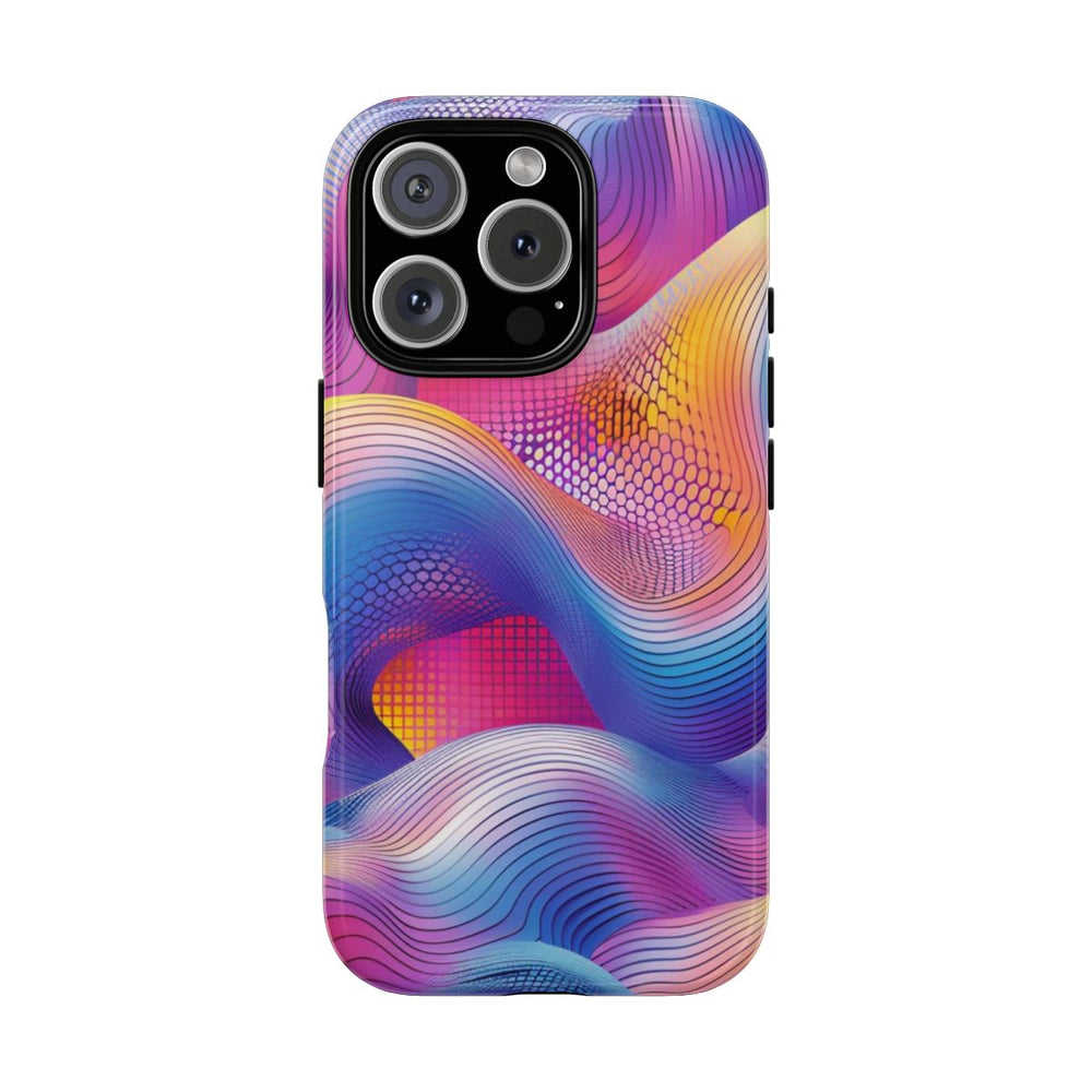 Dit telefoonhoesje heeft een abstract ontwerp met vloeiende, golvende vormen over een levendige achtergrond. Zachte kleurverlopen mengen roze, paars, blauw en geel tot een harmonieus geheel. Dunne zwarte lijnen volgen de golven en geven het ontwerp diepte en dynamiek. De achtergrond bevat raster- en stipstructuren in rood- en rozetinten, wat het geheel extra levendig en gedetailleerd maakt. Het ontwerp is gedrukt op een glanzend en stevig hoesje van duurzaam polycarbonaat met een TPU-voering. Het hoesje ondersteunt draadloos opladen en is bestand tegen gebruik buitenshuis.
