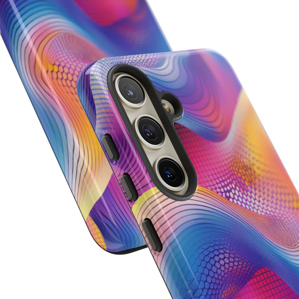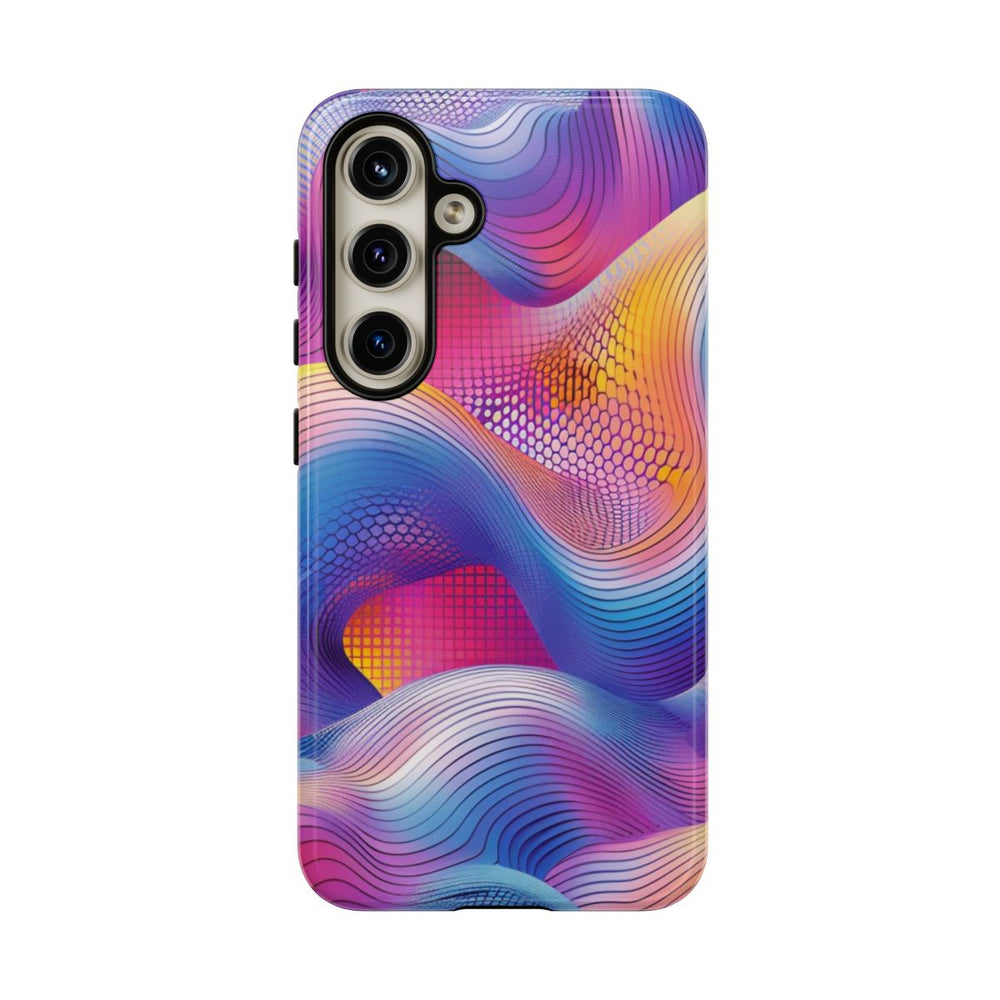 Dit telefoonhoesje heeft een abstract ontwerp met vloeiende, golvende vormen over een levendige achtergrond. Zachte kleurverlopen mengen roze, paars, blauw en geel tot een harmonieus geheel. Dunne zwarte lijnen volgen de golven en geven het ontwerp diepte en dynamiek. De achtergrond bevat raster- en stipstructuren in rood- en rozetinten, wat het geheel extra levendig en gedetailleerd maakt. Het ontwerp is gedrukt op een glanzend en stevig hoesje van duurzaam polycarbonaat met een TPU-voering. Het hoesje ondersteunt draadloos opladen en is bestand tegen gebruik buitenshuis.