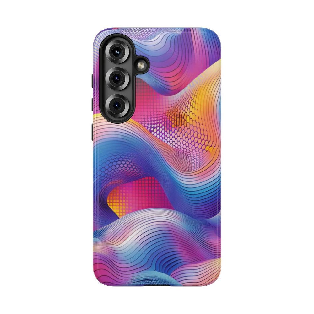 Dit telefoonhoesje heeft een abstract ontwerp met vloeiende, golvende vormen over een levendige achtergrond. Zachte kleurverlopen mengen roze, paars, blauw en geel tot een harmonieus geheel. Dunne zwarte lijnen volgen de golven en geven het ontwerp diepte en dynamiek. De achtergrond bevat raster- en stipstructuren in rood- en rozetinten, wat het geheel extra levendig en gedetailleerd maakt. Het ontwerp is gedrukt op een glanzend en stevig hoesje van duurzaam polycarbonaat met een TPU-voering. Het hoesje ondersteunt draadloos opladen en is bestand tegen gebruik buitenshuis.