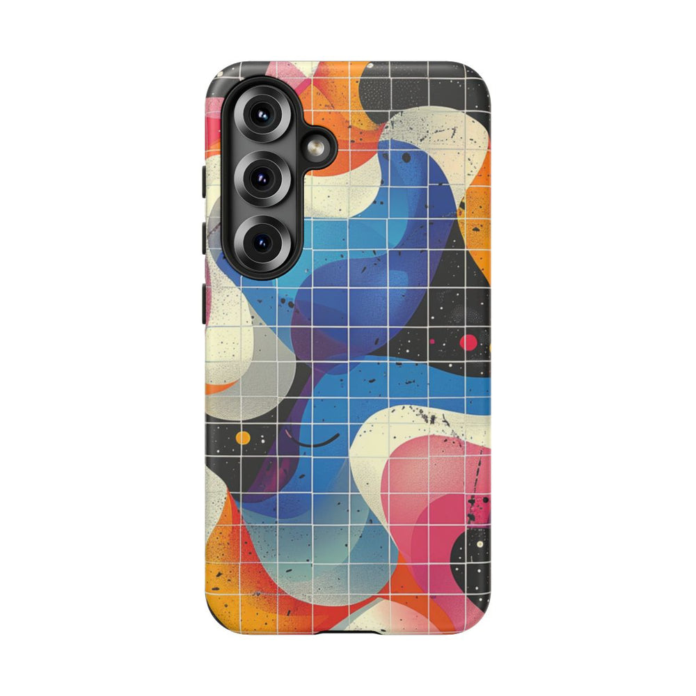Dit telefoonhoesje heeft een abstract ontwerp met golvende vormen in levendige kleuren zoals blauw, oranje, roze, wit en zwart. De soepele lijnen en gelaagde vormen zorgen voor een dynamische, vloeiende uitstraling. Kleine stipjes en spikkels zijn over het patroon verspreid en geven extra diepte en textuur. Het matte hoesje is stevig uitgevoerd met een dubbele laag van polycarbonaat en TPU, waardoor het bestand is tegen stoten en geschikt is voor buitengebruik. Dit hoesje ondersteunt draadloos opladen.