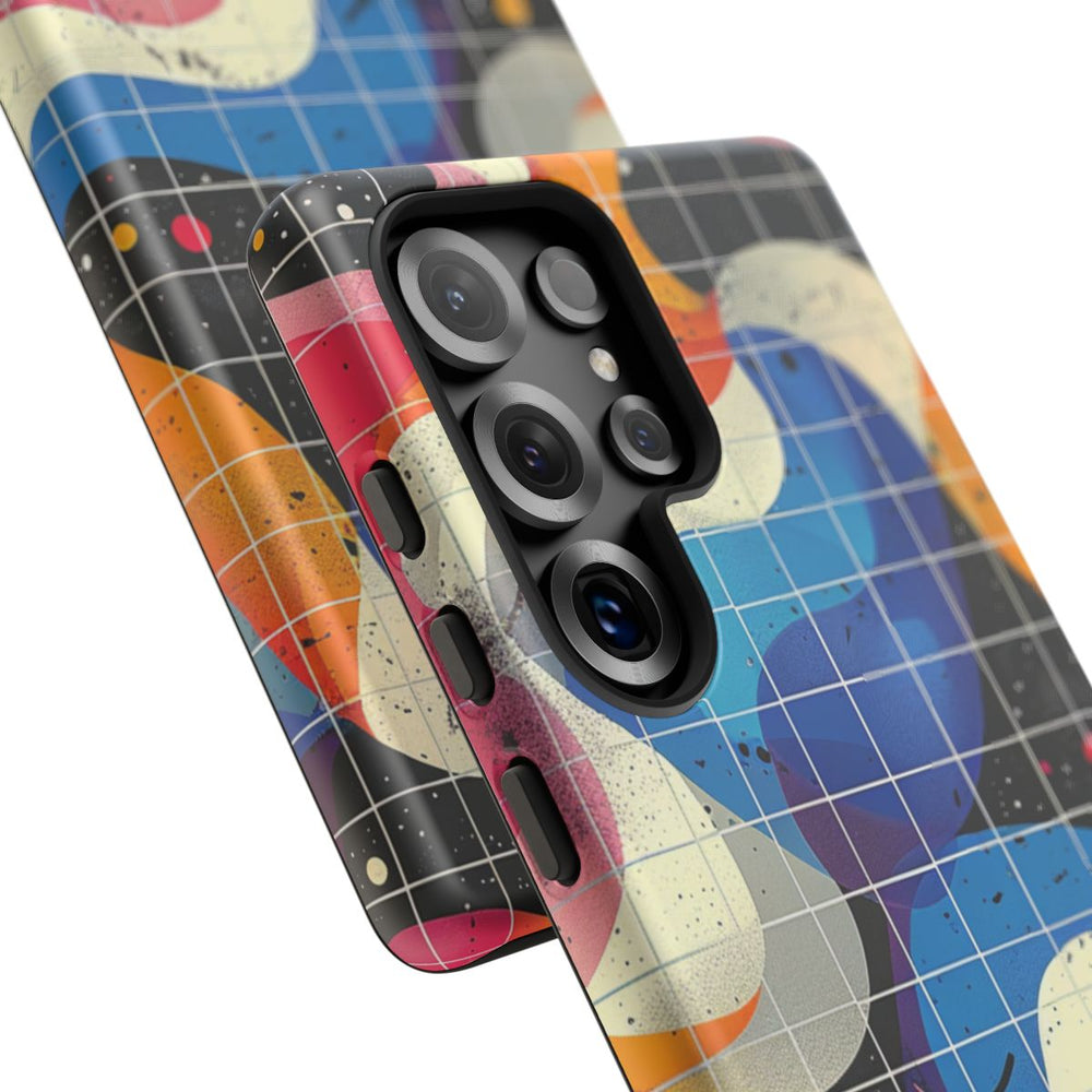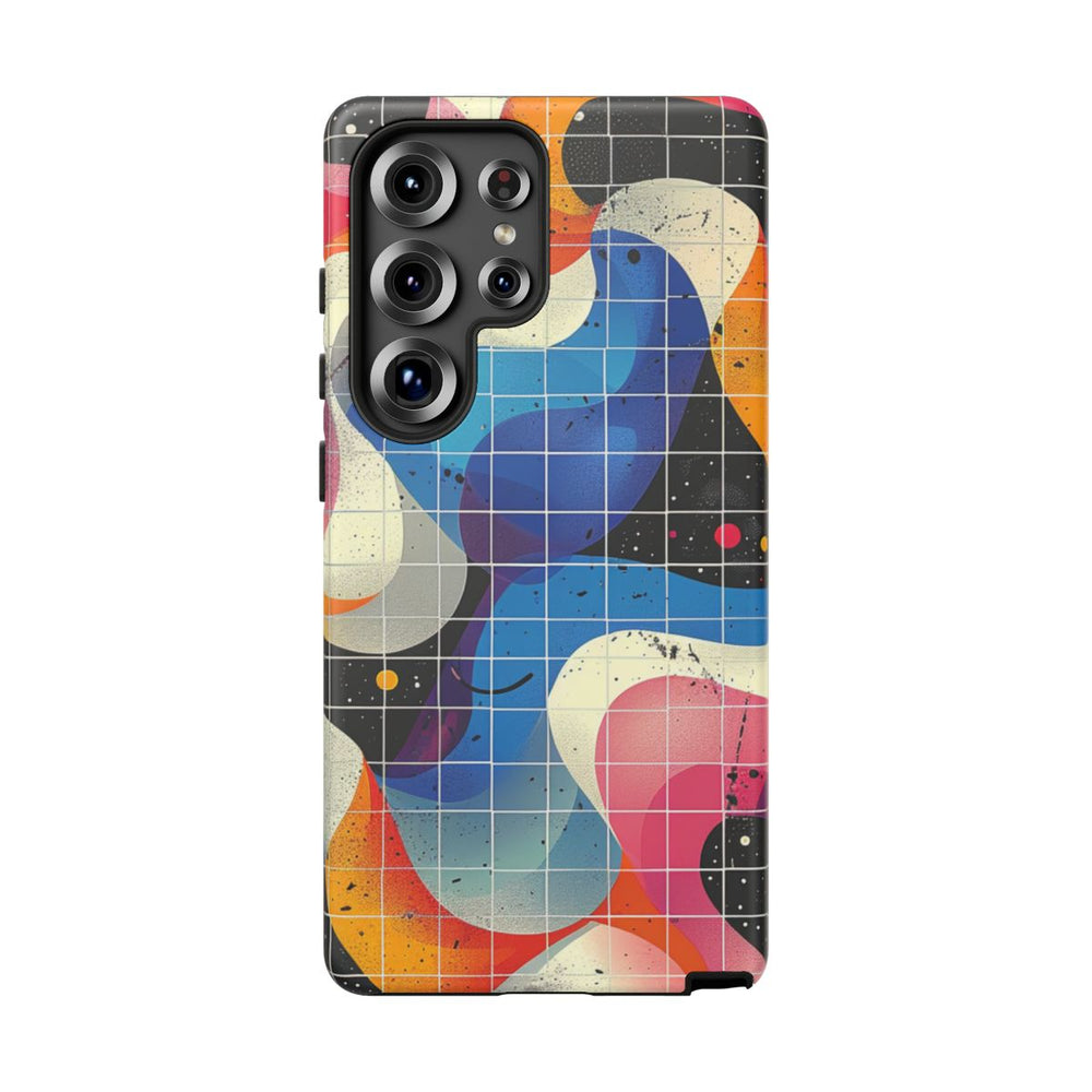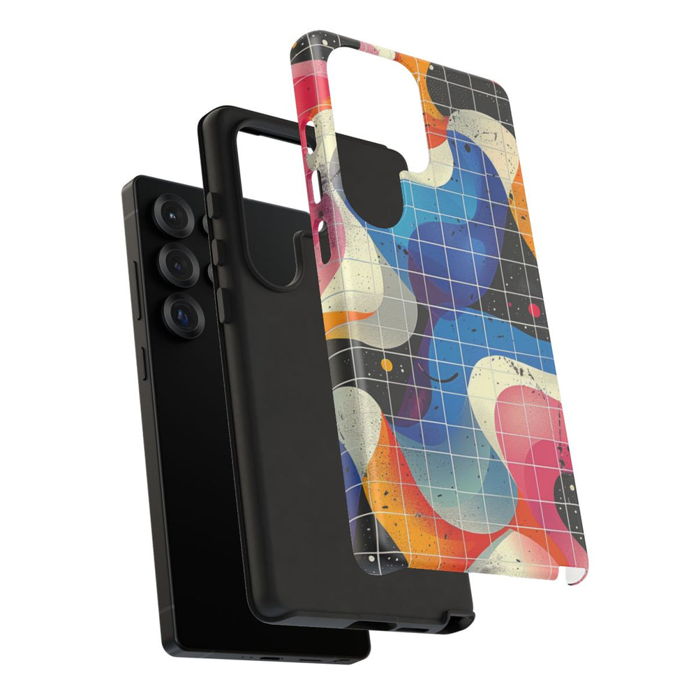 Dit telefoonhoesje heeft een abstract ontwerp met golvende vormen in levendige kleuren zoals blauw, oranje, roze, wit en zwart. De soepele lijnen en gelaagde vormen zorgen voor een dynamische, vloeiende uitstraling. Kleine stipjes en spikkels zijn over het patroon verspreid en geven extra diepte en textuur. Het matte hoesje is stevig uitgevoerd met een dubbele laag van polycarbonaat en TPU, waardoor het bestand is tegen stoten en geschikt is voor buitengebruik. Dit hoesje ondersteunt draadloos opladen.