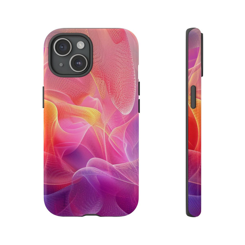 Dit hoesje is voorzien van een abstract ontwerp met vloeiende, doorschijnende vormen die doen denken aan golvend textiel. De levendige kleuren, zoals paars, roze, rood, oranje en accenten van blauw, zorgen voor een dynamisch en opvallend geheel. De zachte, gelaagde structuren creëren diepte en beweging, alsof je kijkt naar sierlijke golven of plooien. De afbeelding is gedrukt op een glanzend, stevig hoesje met een dubbele laag van polycarbonaat en TPU voor extra stevigheid en bescherming. Het hoesje ondersteunt draadloos opladen en combineert stijl met functionaliteit.