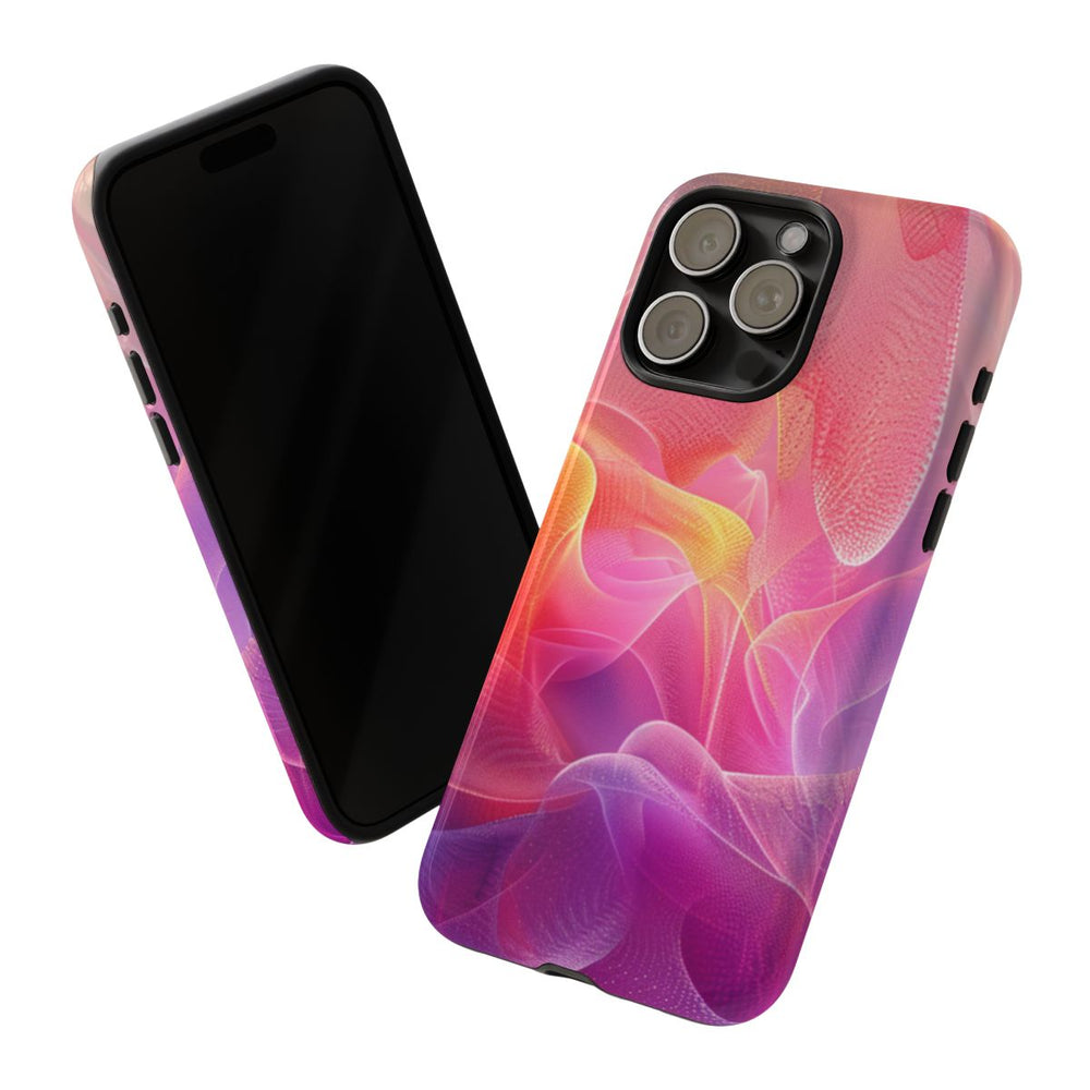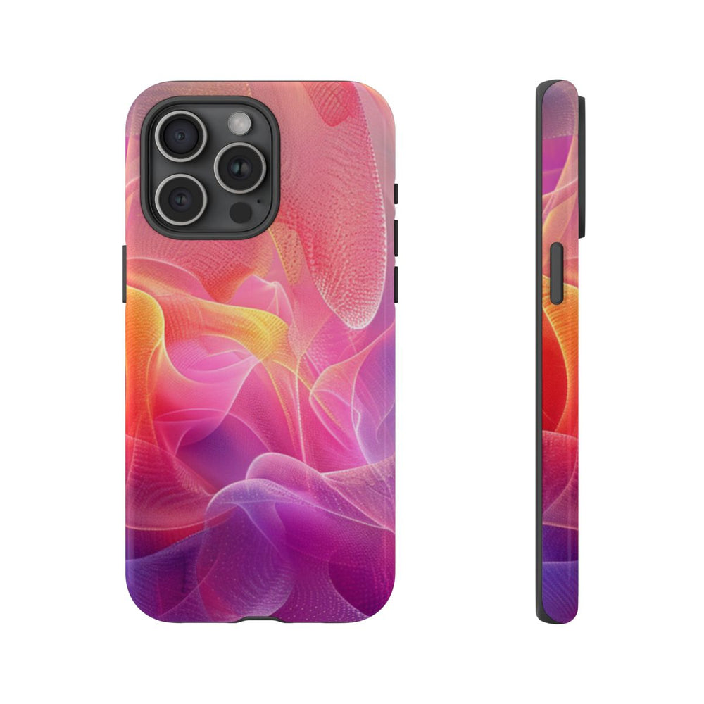 Dit hoesje is voorzien van een abstract ontwerp met vloeiende, doorschijnende vormen die doen denken aan golvend textiel. De levendige kleuren, zoals paars, roze, rood, oranje en accenten van blauw, zorgen voor een dynamisch en opvallend geheel. De zachte, gelaagde structuren creëren diepte en beweging, alsof je kijkt naar sierlijke golven of plooien. De afbeelding is gedrukt op een glanzend, stevig hoesje met een dubbele laag van polycarbonaat en TPU voor extra stevigheid en bescherming. Het hoesje ondersteunt draadloos opladen en combineert stijl met functionaliteit.