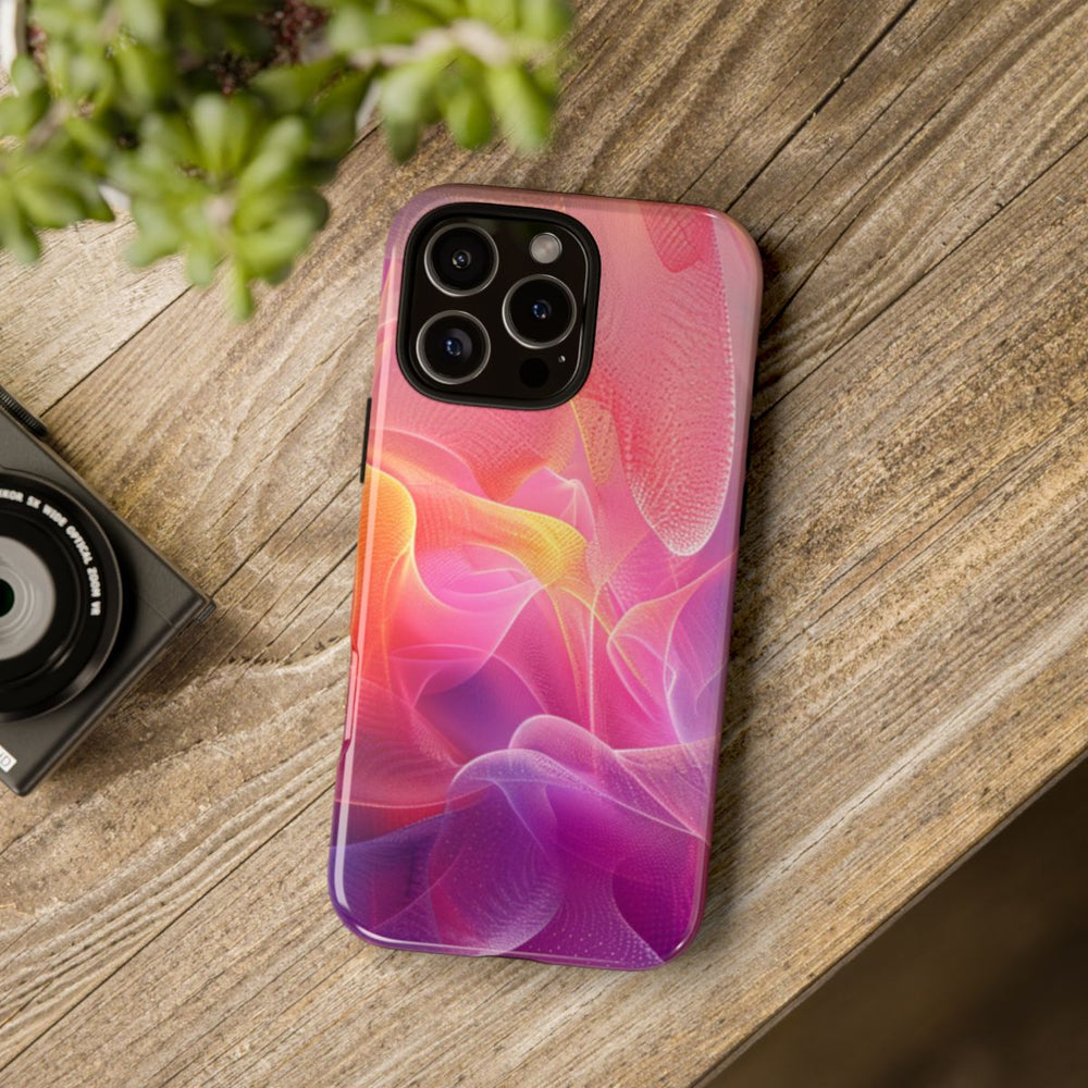 Dit hoesje is voorzien van een abstract ontwerp met vloeiende, doorschijnende vormen die doen denken aan golvend textiel. De levendige kleuren, zoals paars, roze, rood, oranje en accenten van blauw, zorgen voor een dynamisch en opvallend geheel. De zachte, gelaagde structuren creëren diepte en beweging, alsof je kijkt naar sierlijke golven of plooien. De afbeelding is gedrukt op een glanzend, stevig hoesje met een dubbele laag van polycarbonaat en TPU voor extra stevigheid en bescherming. Het hoesje ondersteunt draadloos opladen en combineert stijl met functionaliteit.