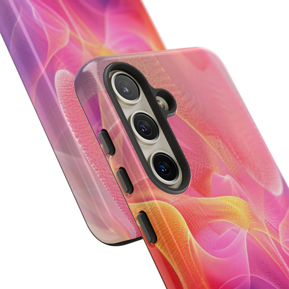 Dit hoesje is voorzien van een abstract ontwerp met vloeiende, doorschijnende vormen die doen denken aan golvend textiel. De levendige kleuren, zoals paars, roze, rood, oranje en accenten van blauw, zorgen voor een dynamisch en opvallend geheel. De zachte, gelaagde structuren creëren diepte en beweging, alsof je kijkt naar sierlijke golven of plooien. De afbeelding is gedrukt op een glanzend, stevig hoesje met een dubbele laag van polycarbonaat en TPU voor extra stevigheid en bescherming. Het hoesje ondersteunt draadloos opladen en combineert stijl met functionaliteit.