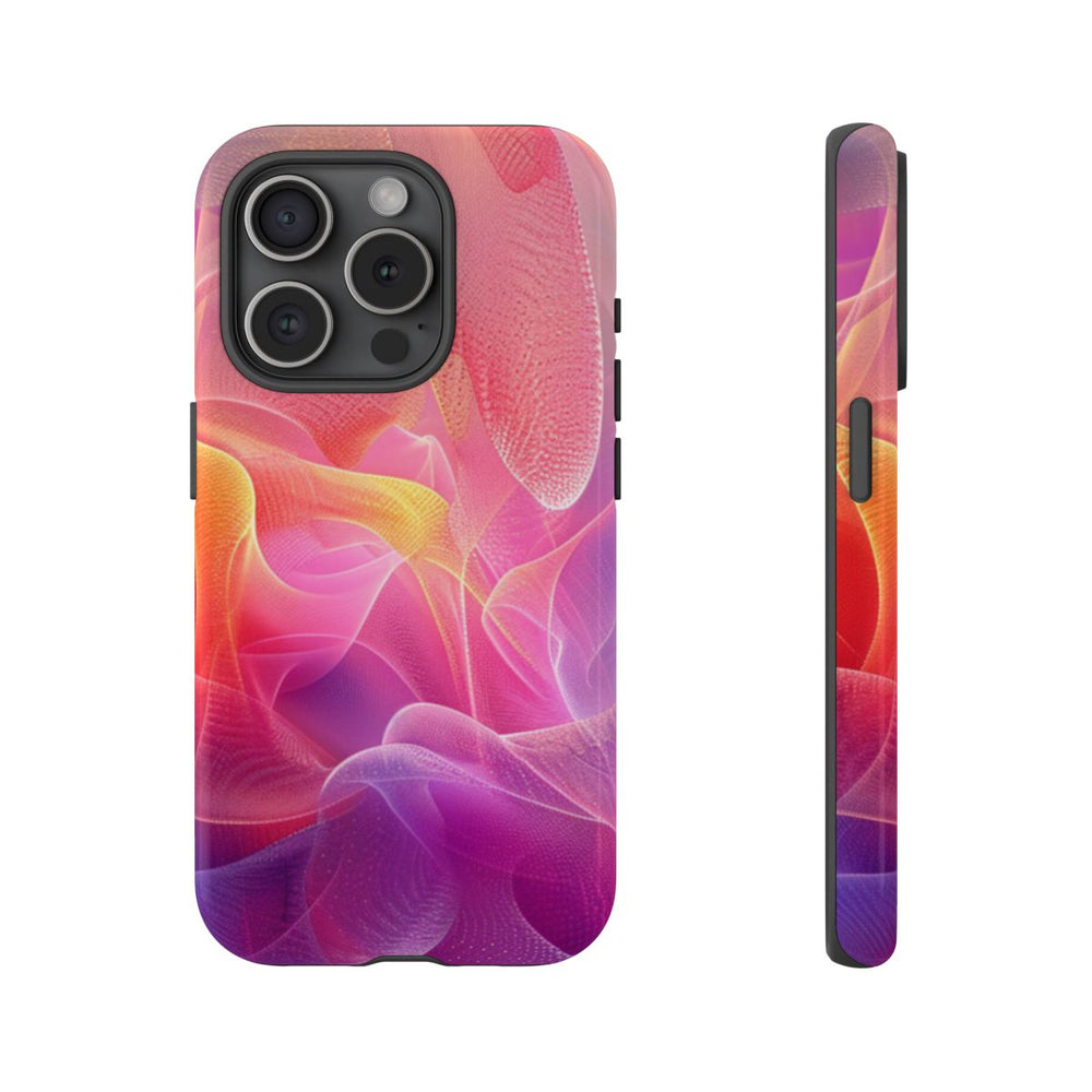 Dit telefoonhoesje heeft een levendig, abstract fractalpatroon met vloeiende, doorschijnende vormen die naadloos in elkaar overlopen. De kleuren variëren van warme rood- en oranjetinten tot koele paarse en blauwe accenten, wat zorgt voor een dynamisch en opvallend kleurverloop. De textuur oogt zacht en verfijnd, vergelijkbaar met fijn gaas of stof. Het hoesje is glanzend afgewerkt en bestaat uit een stevige dubbele laag met een polycarbonaat buitenkant en een TPU-binnenzijde, waardoor het extra sterk is en optimale bescherming biedt. Het ondersteunt draadloos opladen en is bestand tegen weersinvloeden, zodat het uiterlijk langdurig mooi blijft.