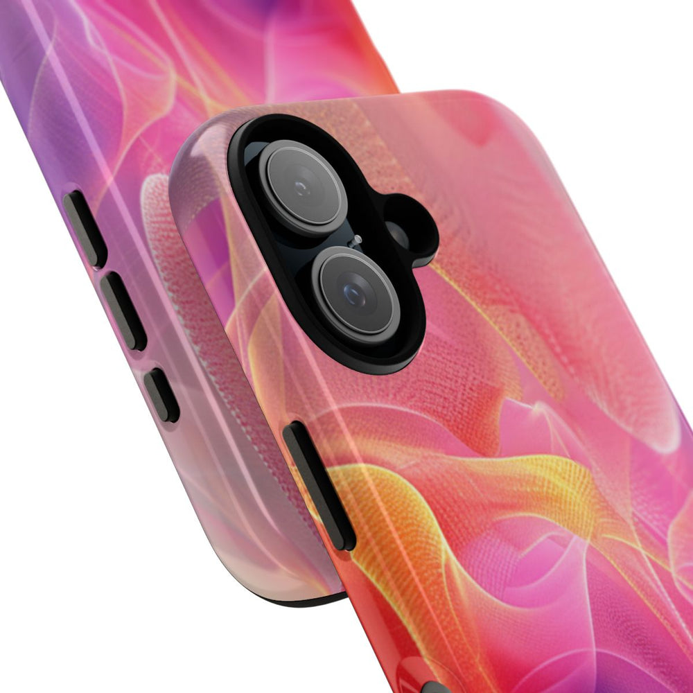 Dit telefoonhoesje heeft een levendig, abstract fractalpatroon met vloeiende, doorschijnende vormen die naadloos in elkaar overlopen. De kleuren variëren van warme rood- en oranjetinten tot koele paarse en blauwe accenten, wat zorgt voor een dynamisch en opvallend kleurverloop. De textuur oogt zacht en verfijnd, vergelijkbaar met fijn gaas of stof. Het hoesje is glanzend afgewerkt en bestaat uit een stevige dubbele laag met een polycarbonaat buitenkant en een TPU-binnenzijde, waardoor het extra sterk is en optimale bescherming biedt. Het ondersteunt draadloos opladen en is bestand tegen weersinvloeden, zodat het uiterlijk langdurig mooi blijft.