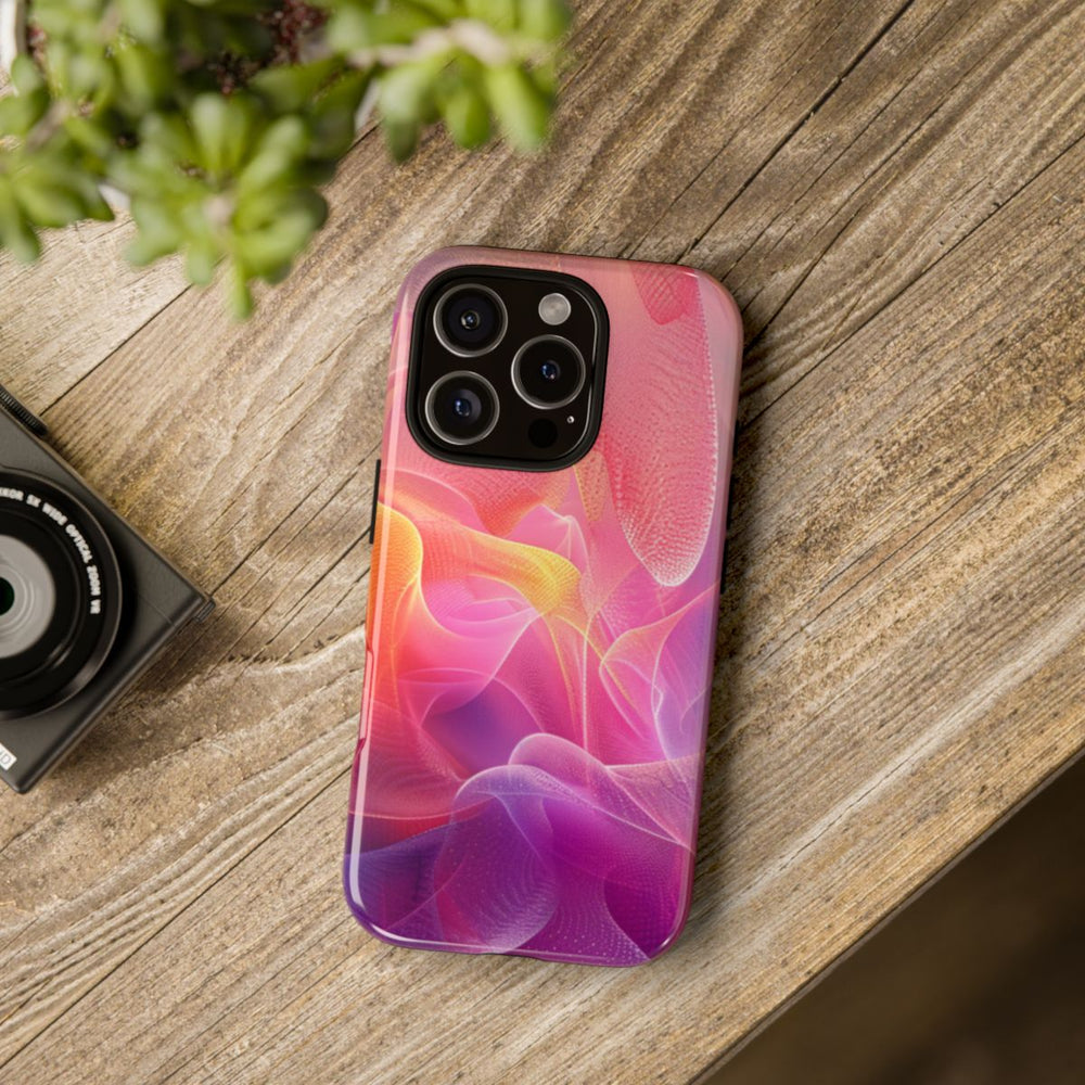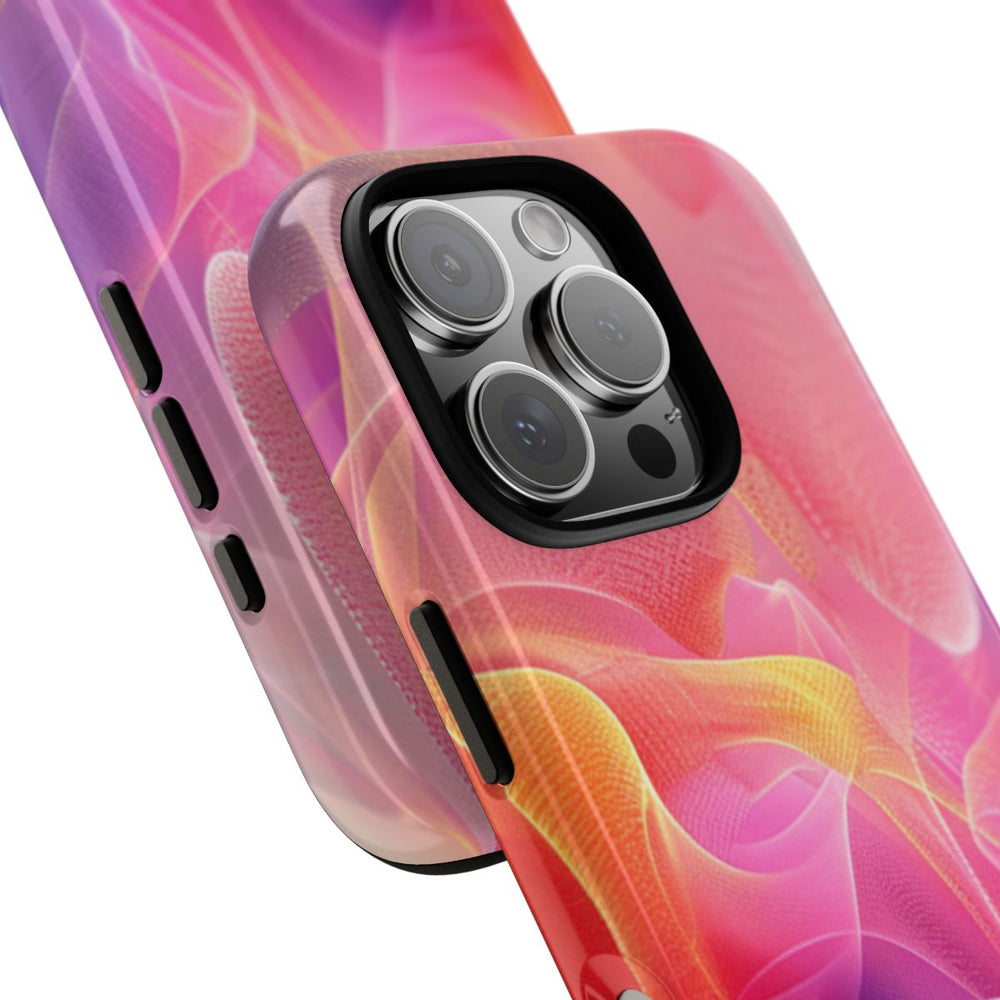 Dit telefoonhoesje heeft een levendig, abstract fractalpatroon met vloeiende, doorschijnende vormen die naadloos in elkaar overlopen. De kleuren variëren van warme rood- en oranjetinten tot koele paarse en blauwe accenten, wat zorgt voor een dynamisch en opvallend kleurverloop. De textuur oogt zacht en verfijnd, vergelijkbaar met fijn gaas of stof. Het hoesje is glanzend afgewerkt en bestaat uit een stevige dubbele laag met een polycarbonaat buitenkant en een TPU-binnenzijde, waardoor het extra sterk is en optimale bescherming biedt. Het ondersteunt draadloos opladen en is bestand tegen weersinvloeden, zodat het uiterlijk langdurig mooi blijft.