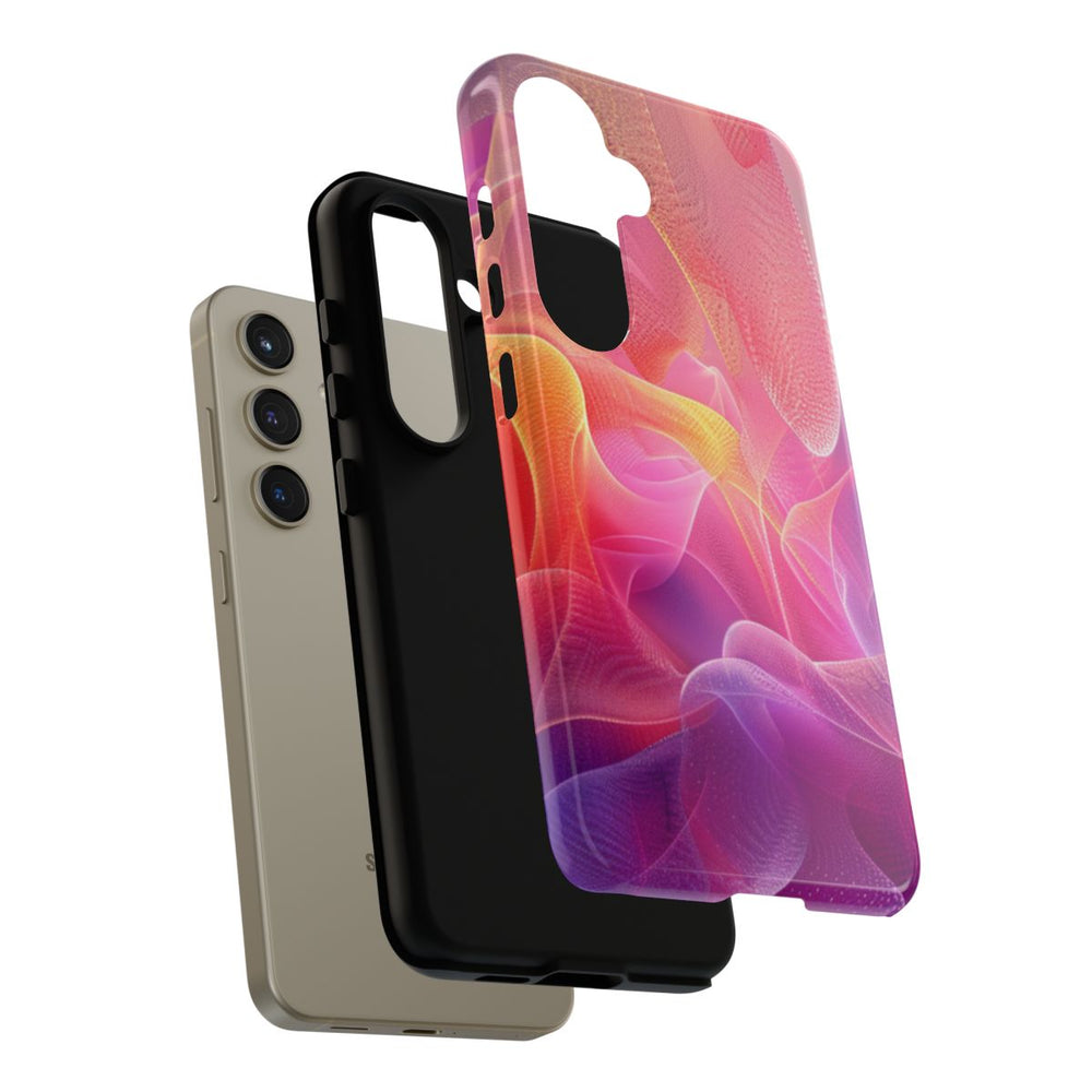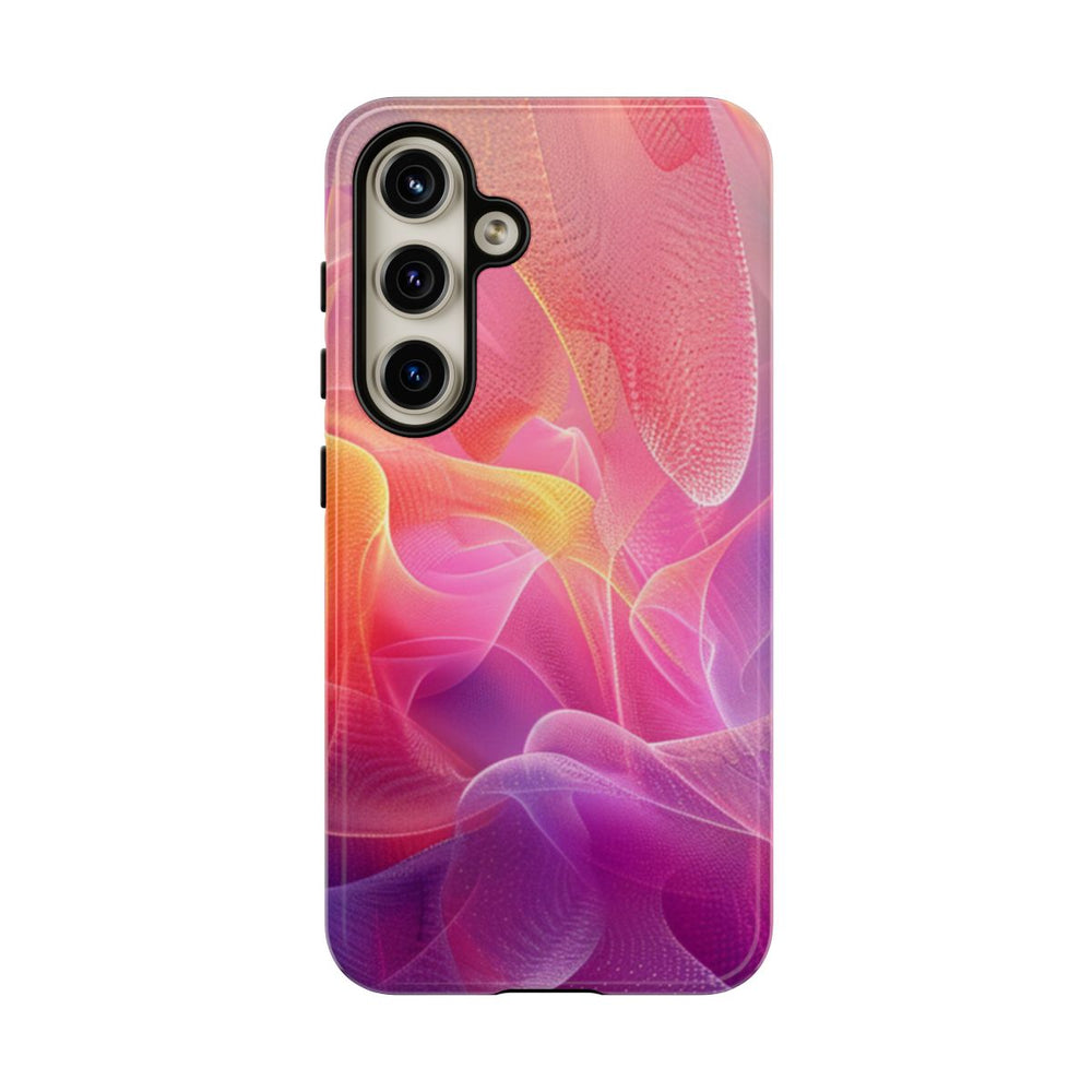 Dit telefoonhoesje heeft een levendig, abstract fractalpatroon met vloeiende, doorschijnende vormen die naadloos in elkaar overlopen. De kleuren variëren van warme rood- en oranjetinten tot koele paarse en blauwe accenten, wat zorgt voor een dynamisch en opvallend kleurverloop. De textuur oogt zacht en verfijnd, vergelijkbaar met fijn gaas of stof. Het hoesje is glanzend afgewerkt en bestaat uit een stevige dubbele laag met een polycarbonaat buitenkant en een TPU-binnenzijde, waardoor het extra sterk is en optimale bescherming biedt. Het ondersteunt draadloos opladen en is bestand tegen weersinvloeden, zodat het uiterlijk langdurig mooi blijft.