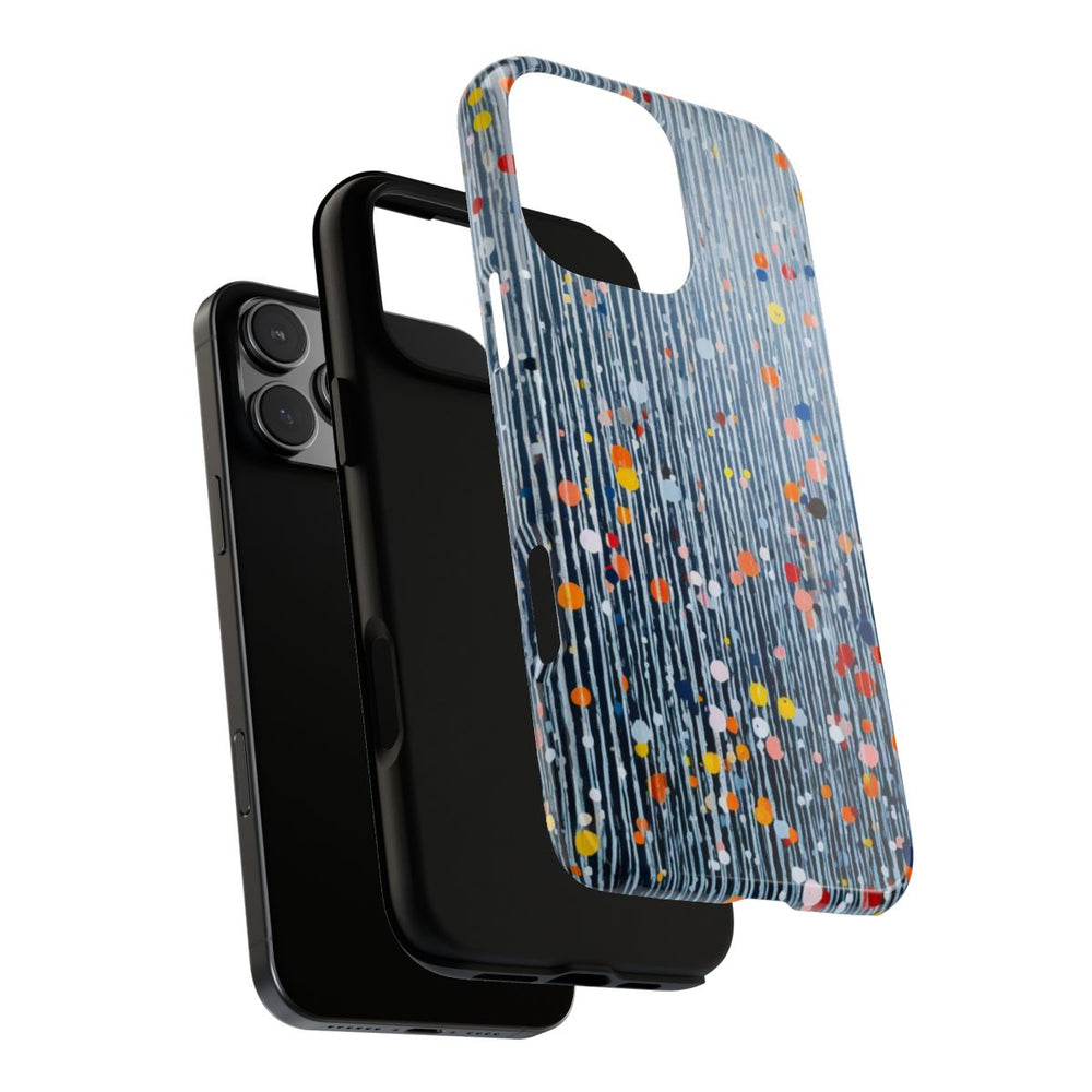 Dit telefoonhoesje heeft een opvallend abstract ontwerp met verticale witte lijnen op een donkerblauwe achtergrond. Verspreid over het geheel zijn talrijke kleurrijke stippen in tinten rood, oranje, geel, blauw, roze en wit, wat zorgt voor een levendig en dynamisch effect. Het patroon is gelijkmatig verdeeld en straalt energie en beweging uit. Het hoesje is glanzend en stevig, met een buitenkant van polycarbonaat en een binnenzijde van TPU, waardoor het extra bescherming biedt en geschikt is voor draadloos opladen.