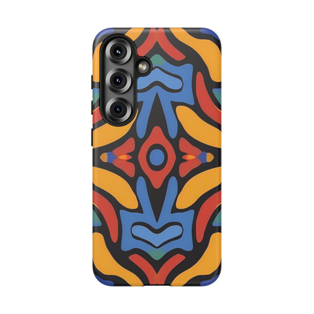 Dit hoesje is voorzien van een levendig abstract patroon met opvallende vormen en vloeiende lijnen. Het ontwerp bevat overwegend gele, rode, blauwe en groene tinten, omlijnd met zwart. De symmetrische en organische vormen zorgen voor een dynamisch en in het oog springend effect. Het patroon is gedrukt op een mat hoesje met een stevige polycarbonaat buitenkant en een TPU binnenzijde, wat zorgt voor dubbele bescherming en ondersteuning voor draadloos opladen. Het hoesje is bestand tegen weersinvloeden en behoudt langdurig zijn heldere uitstraling.