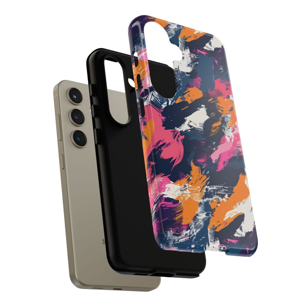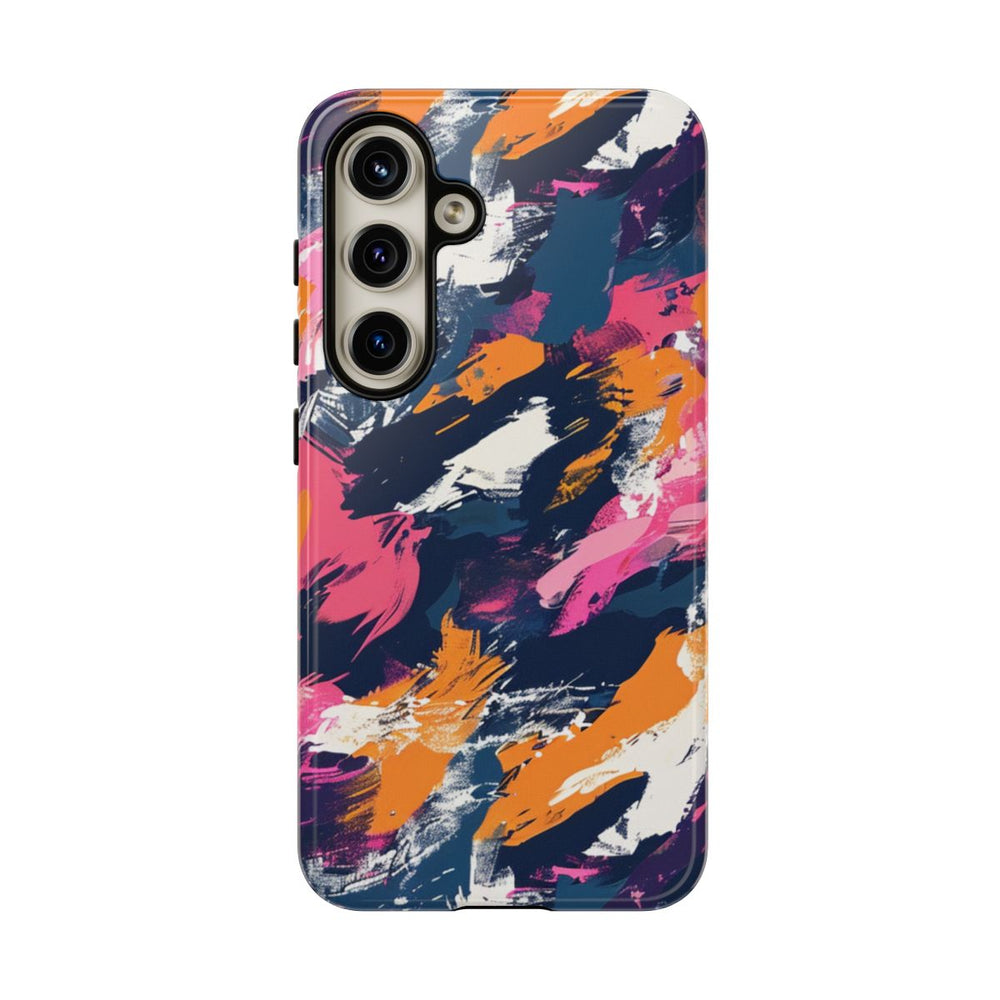 Dit telefoonhoesje is voorzien van een levendig abstract patroon met dynamische penseelstrepen in oranje, roze, wit, donkerblauw en paars. De energieke compositie zorgt voor een speelse en artistieke uitstraling die het gehele oppervlak bedekt. Het hoesje heeft een glanzende afwerking en is extra stevig dankzij de dubbele laag: een buitenkant van polycarbonaat en een binnenzijde van TPU voor optimale bescherming. Geschikt voor draadloos opladen en bestand tegen invloeden van buitenaf, terwijl de heldere uitstraling langdurig behouden blijft.