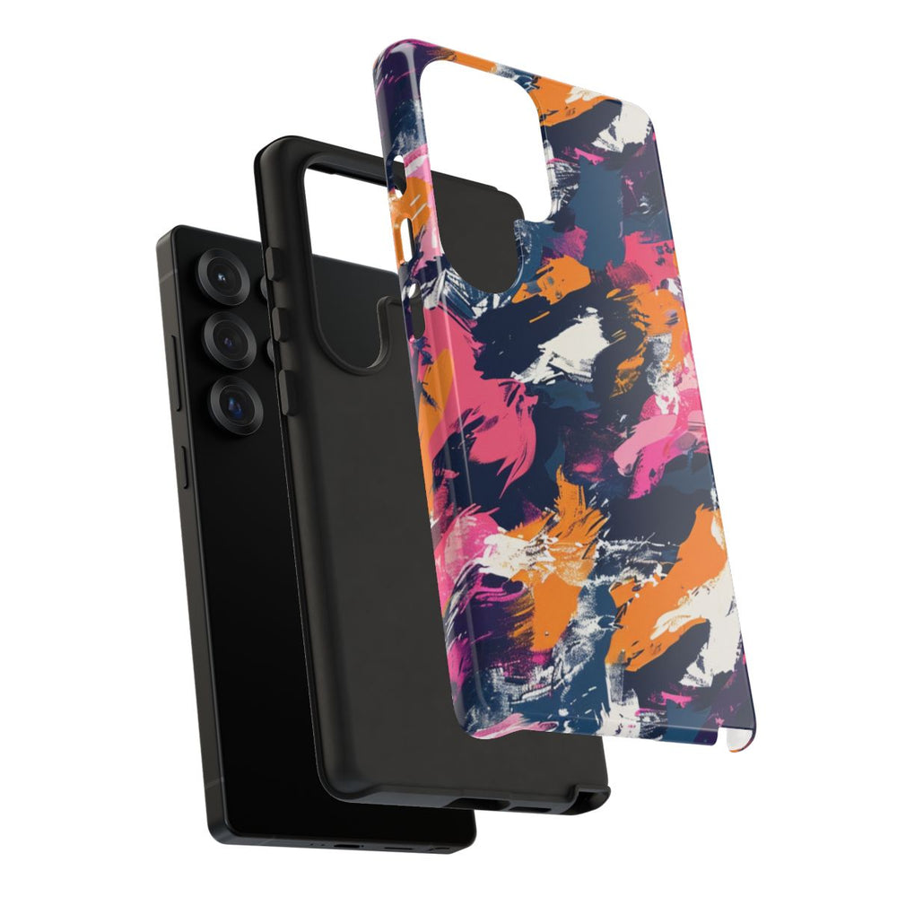 Dit telefoonhoesje is voorzien van een levendig abstract patroon met dynamische penseelstrepen in oranje, roze, wit, donkerblauw en paars. De energieke compositie zorgt voor een speelse en artistieke uitstraling die het gehele oppervlak bedekt. Het hoesje heeft een glanzende afwerking en is extra stevig dankzij de dubbele laag: een buitenkant van polycarbonaat en een binnenzijde van TPU voor optimale bescherming. Geschikt voor draadloos opladen en bestand tegen invloeden van buitenaf, terwijl de heldere uitstraling langdurig behouden blijft.