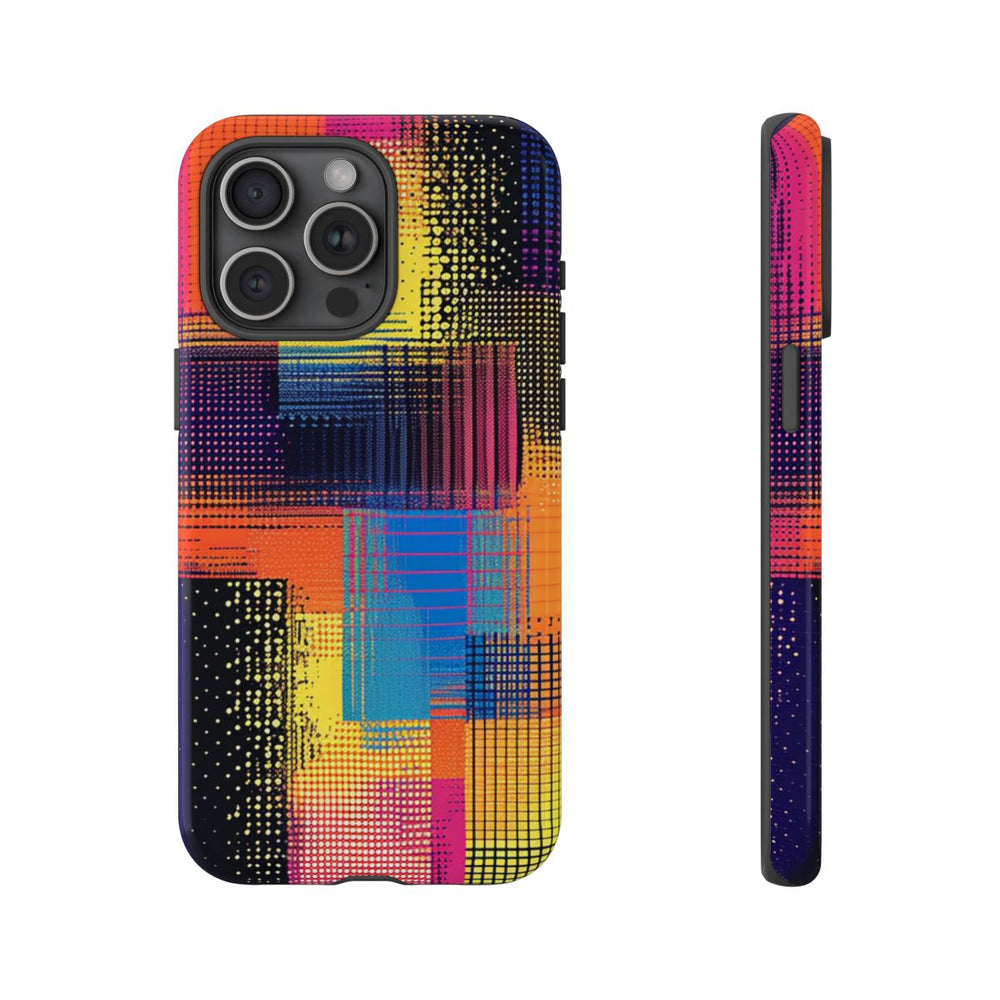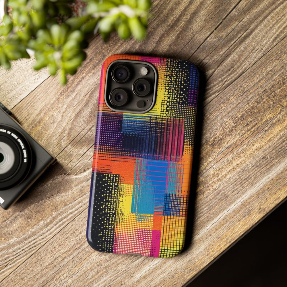 Dit hoesje heeft een opvallend abstract patroon van overlappende rechthoeken en rasters. De heldere neonkleuren, zoals geel, oranje, roze, blauw en zwart, zorgen voor een dynamisch en gepixeld effect. Het ontwerp heeft een moderne, digitale uitstraling met een textuur van stippen en lijnen. Het hoesje is glanzend en extra stevig dankzij de dubbele laag van een polycarbonaat buitenkant en een TPU binnenzijde. Dit biedt optimale bescherming en is geschikt voor draadloos opladen.