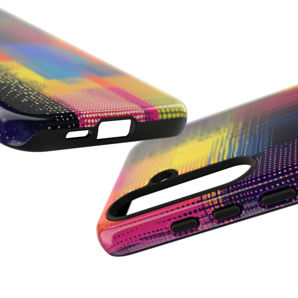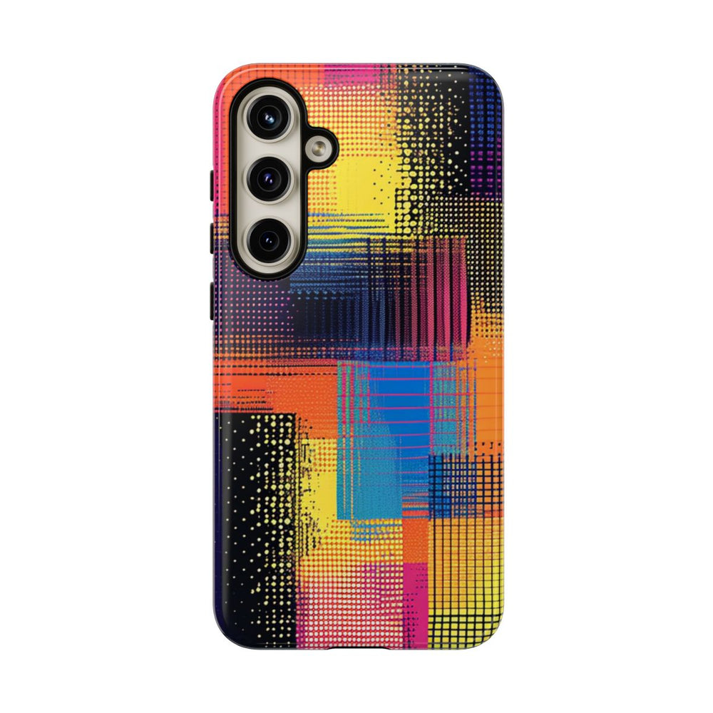 Dit hoesje heeft een opvallend abstract patroon van overlappende rechthoeken en rasters. De heldere neonkleuren, zoals geel, oranje, roze, blauw en zwart, zorgen voor een dynamisch en gepixeld effect. Het ontwerp heeft een moderne, digitale uitstraling met een textuur van stippen en lijnen. Het hoesje is glanzend en extra stevig dankzij de dubbele laag van een polycarbonaat buitenkant en een TPU binnenzijde. Dit biedt optimale bescherming en is geschikt voor draadloos opladen.