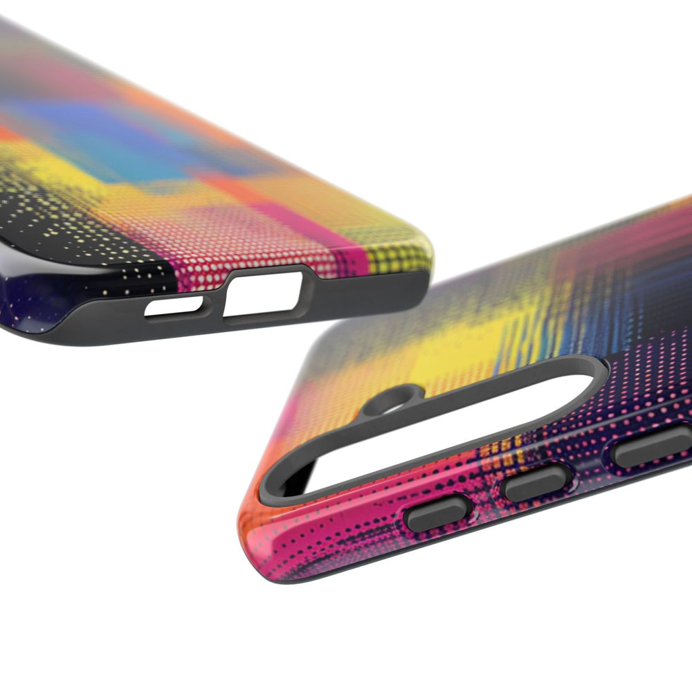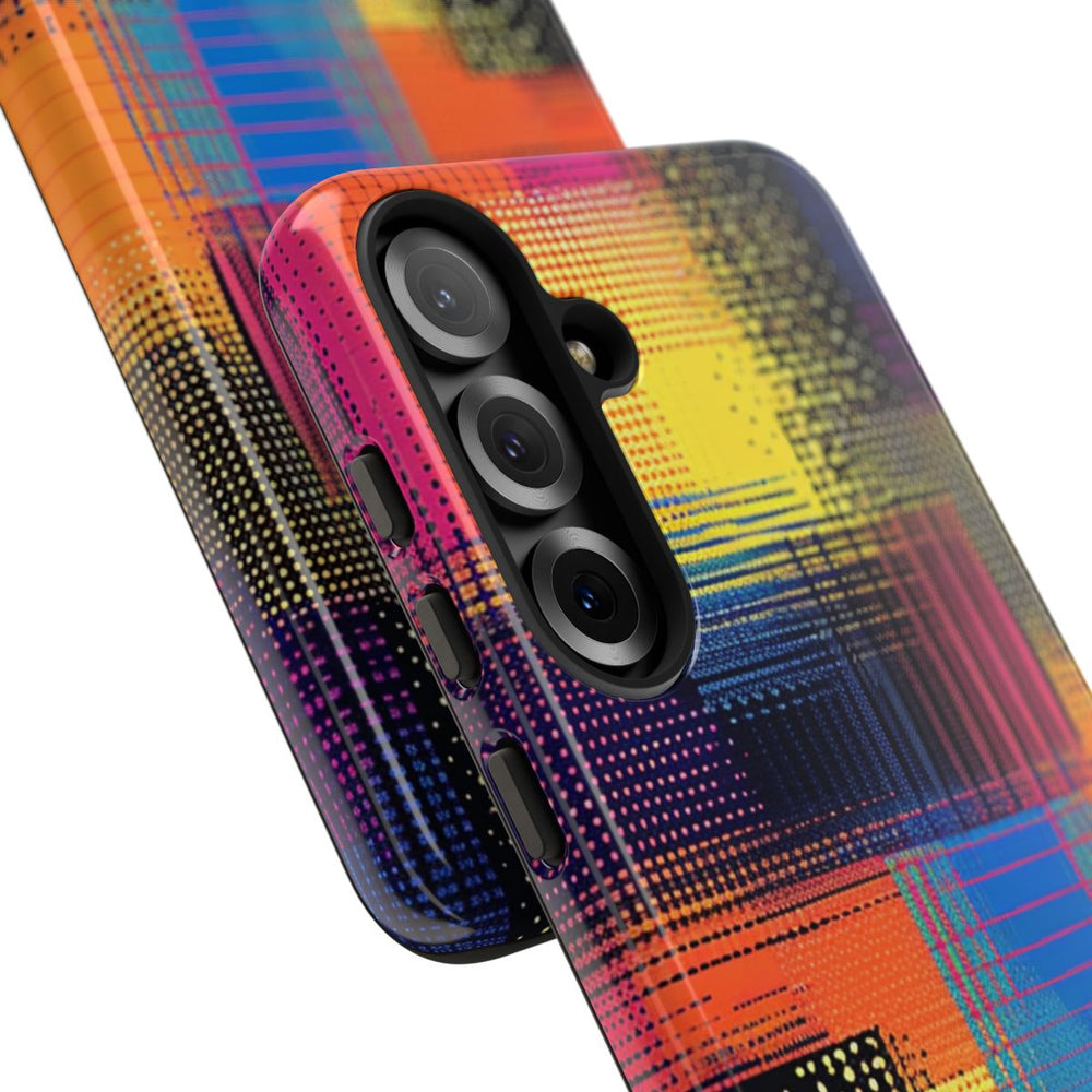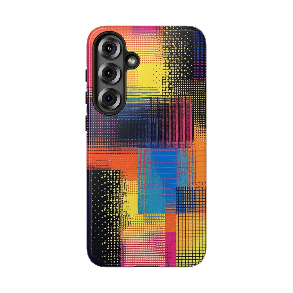 Dit hoesje heeft een opvallend abstract patroon van overlappende rechthoeken en rasters. De heldere neonkleuren, zoals geel, oranje, roze, blauw en zwart, zorgen voor een dynamisch en gepixeld effect. Het ontwerp heeft een moderne, digitale uitstraling met een textuur van stippen en lijnen. Het hoesje is glanzend en extra stevig dankzij de dubbele laag van een polycarbonaat buitenkant en een TPU binnenzijde. Dit biedt optimale bescherming en is geschikt voor draadloos opladen.