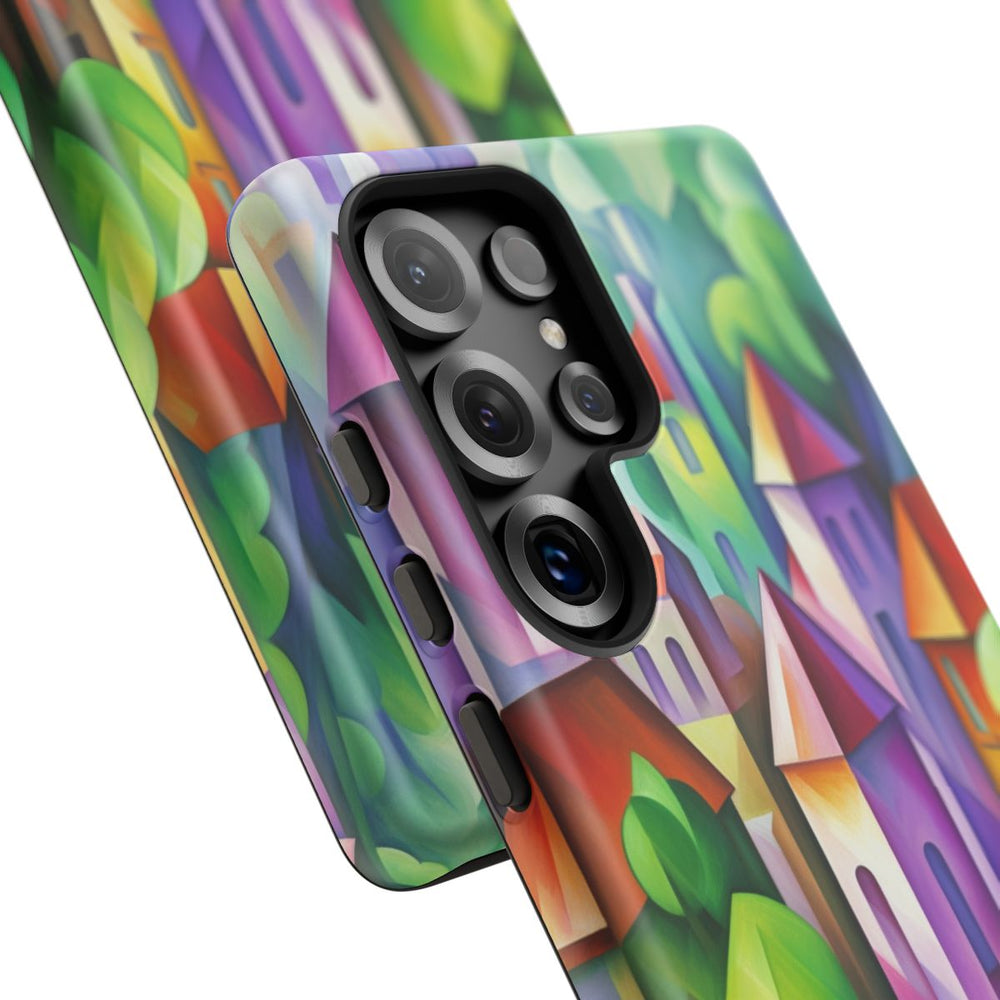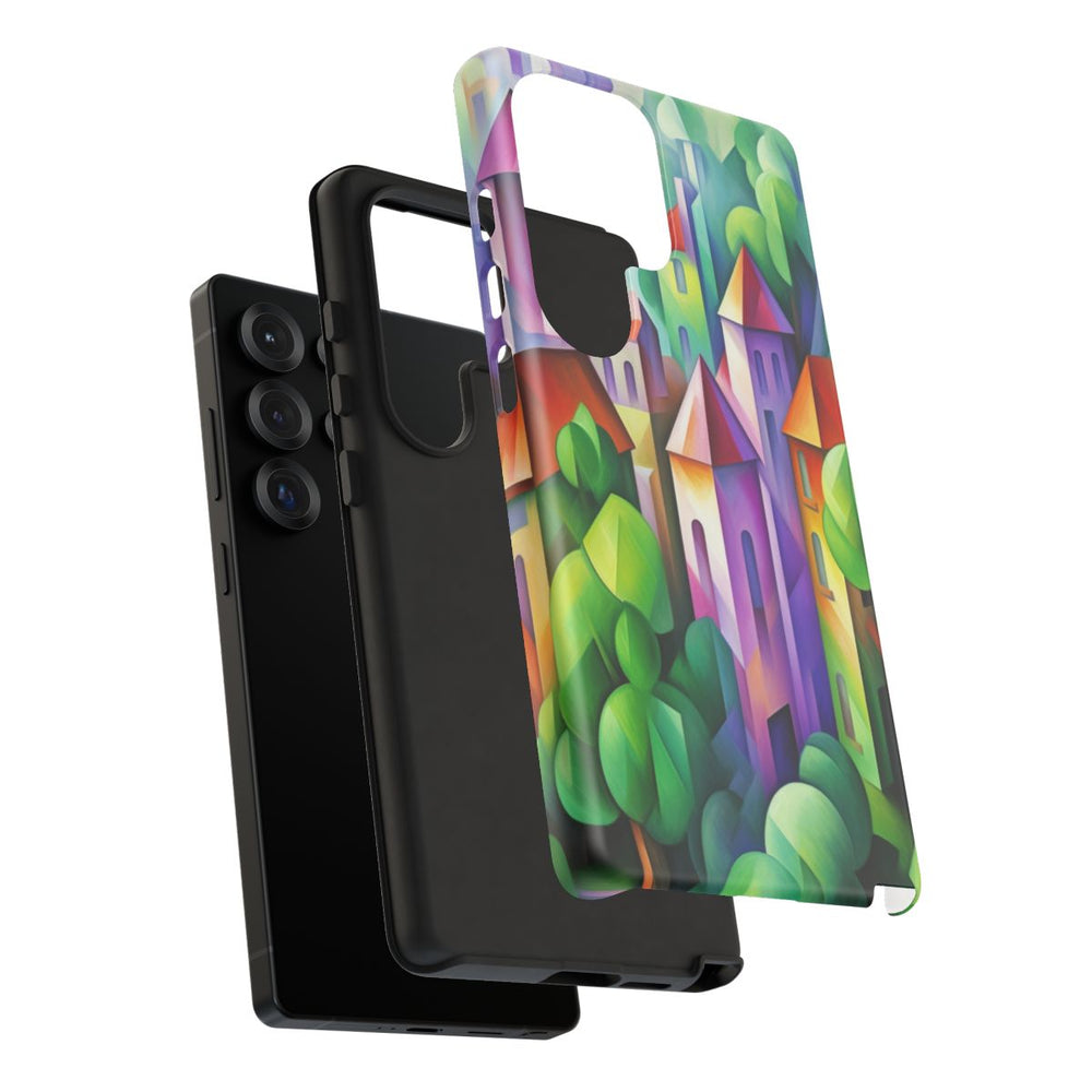 Dit hoesje is voorzien van een levendig abstract stadsgezicht met geometrische vormen en een rijk kleurenpalet. De illustratie toont gestileerde gebouwen met rode daken, omgeven door weelderig groene bomen. Op de achtergrond vloeien paarse en blauwe tinten samen tot een sfeervol geheel. Het hoesje heeft een stevige dubbele laag voor extra duurzaamheid en bescherming, en ondersteunt draadloos opladen. Ideaal voor liefhebbers van moderne kunst en unieke ontwerpen.
