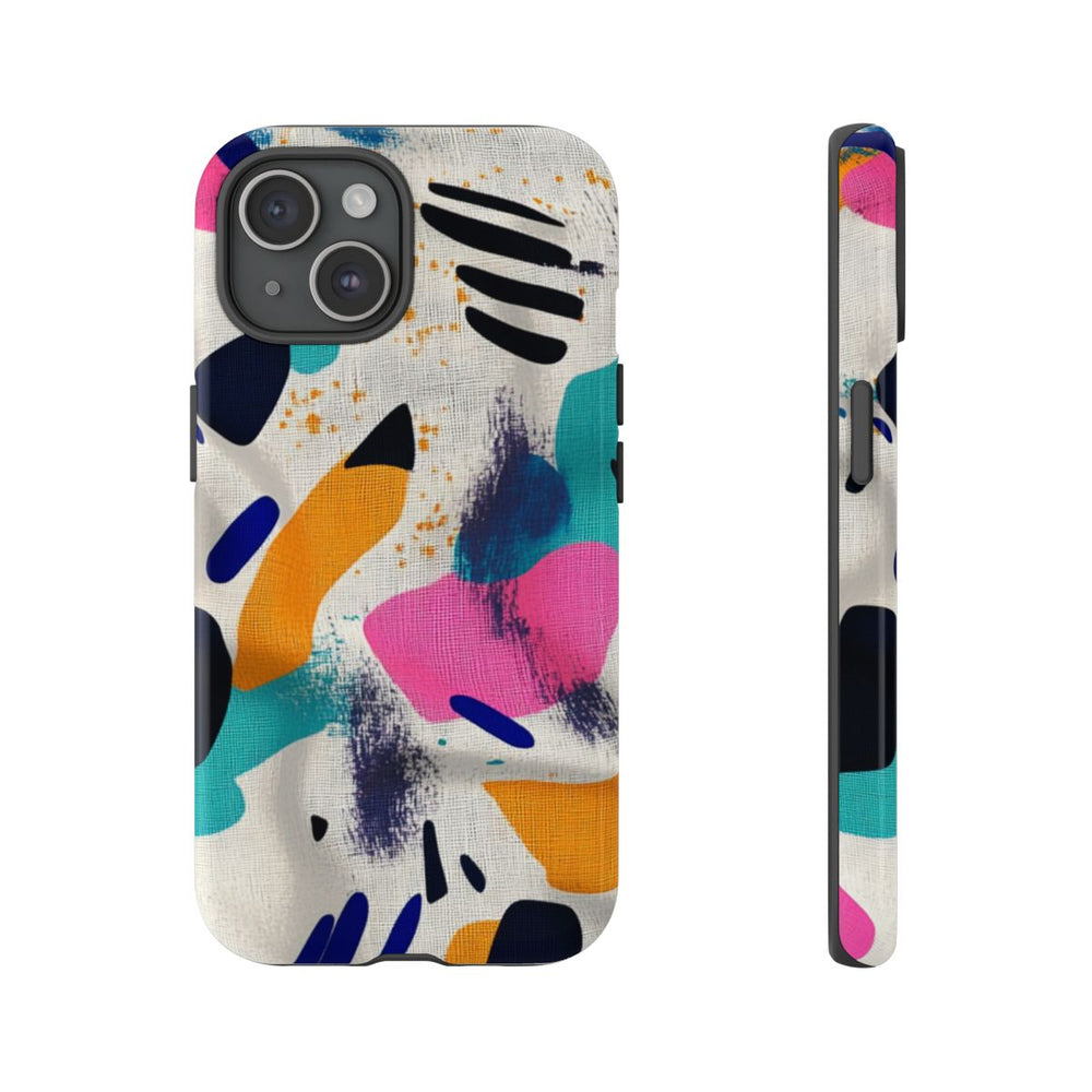 Dit telefoonhoesje heeft een opvallend abstract patroon met grote, onregelmatige vormen in heldere kleuren zoals teal, roze, oranje, perzik en donkerblauw op een witte achtergrond met een geweven textuur. Zwarte penseelstreken en kleine verspreide stipjes zorgen voor een speels contrast. Het patroon lijkt gedrukt op een stofachtige ondergrond met zichtbare weefstructuur. Dit glanzende, stevige hoesje bestaat uit een dubbele laag van polycarbonaat en TPU, wat zorgt voor extra stevigheid en bescherming. Geschikt voor draadloos opladen.