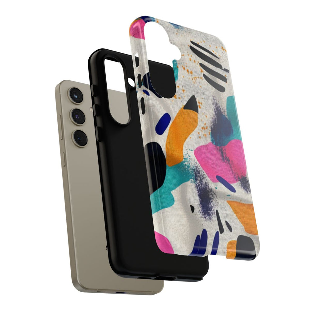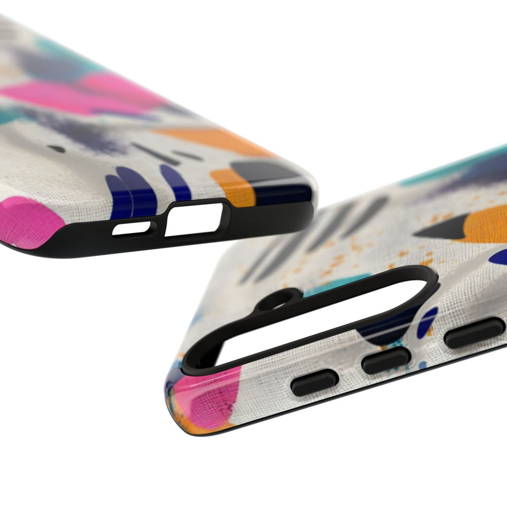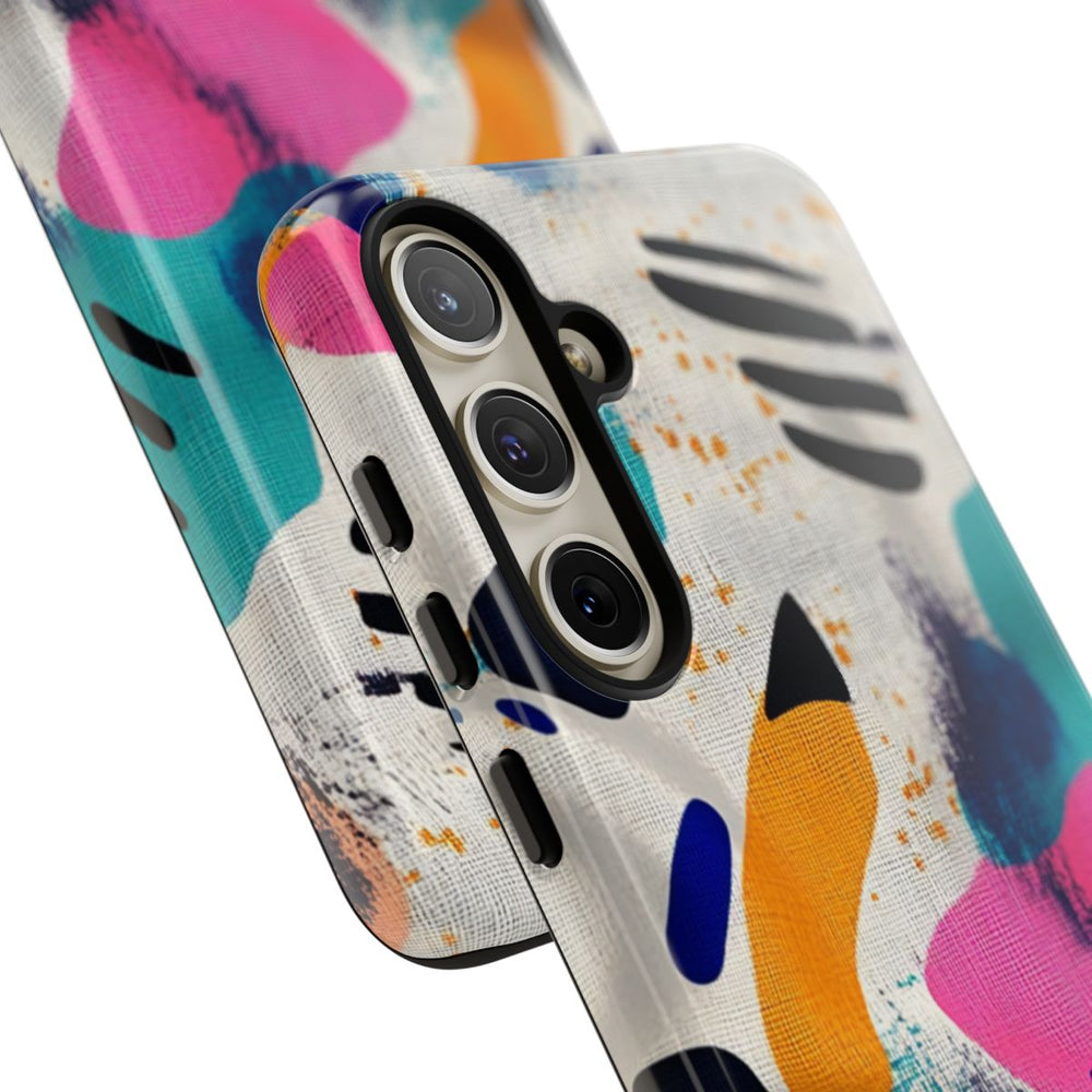 Dit telefoonhoesje heeft een opvallend abstract patroon met grote, onregelmatige vormen in heldere kleuren zoals teal, roze, oranje, perzik en donkerblauw op een witte achtergrond met een geweven textuur. Zwarte penseelstreken en kleine verspreide stipjes zorgen voor een speels contrast. Het patroon lijkt gedrukt op een stofachtige ondergrond met zichtbare weefstructuur. Dit glanzende, stevige hoesje bestaat uit een dubbele laag van polycarbonaat en TPU, wat zorgt voor extra stevigheid en bescherming. Geschikt voor draadloos opladen.
