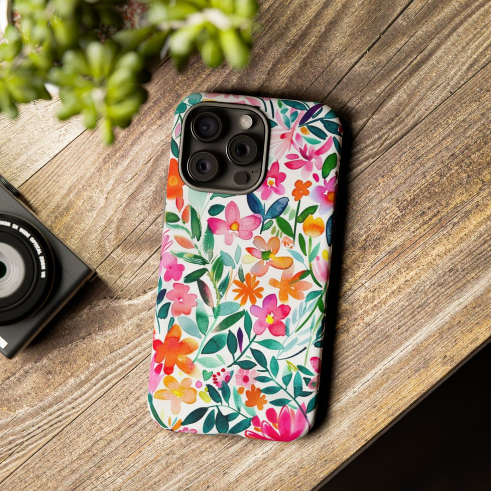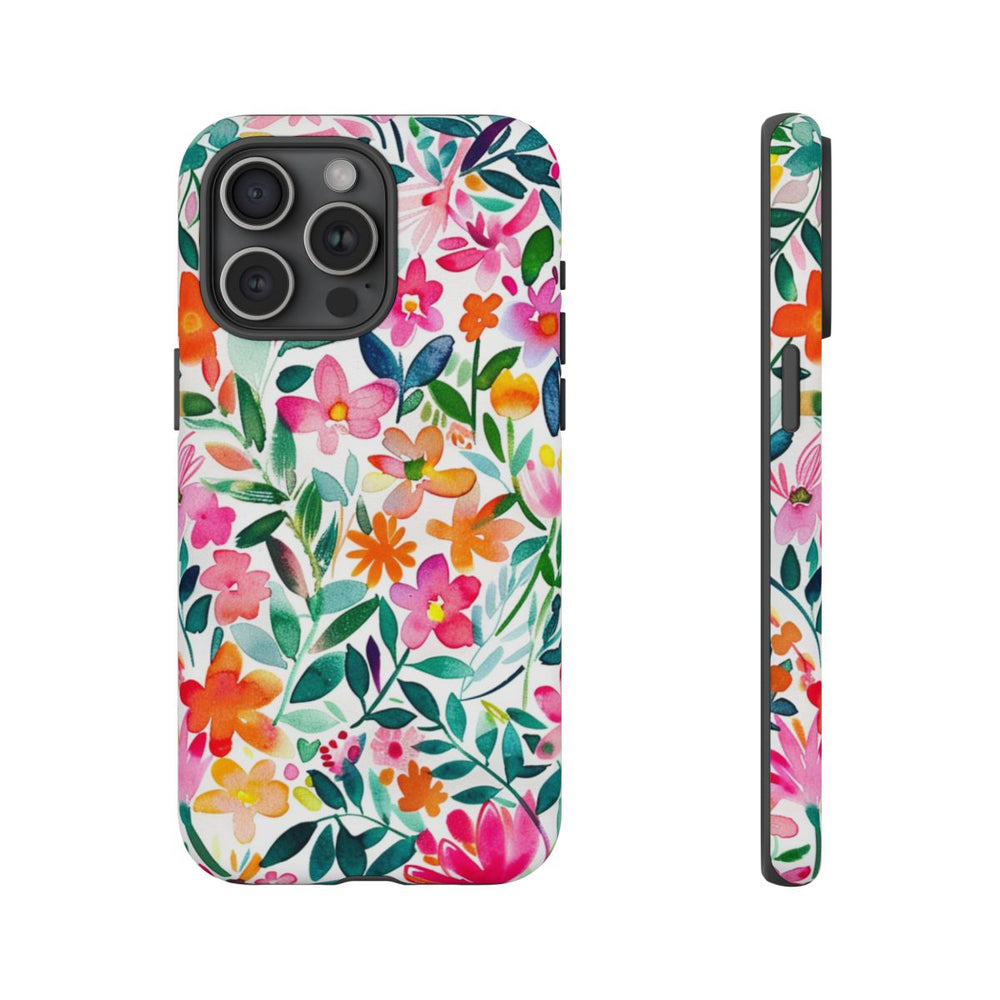 Dit telefoonhoesje is bedrukt met een levendig aquarel bloemenpatroon, bestaande uit diverse kleine bloemen en bladeren. De bloemen zijn geschilderd in heldere tinten roze, oranje, geel en koraal, gecombineerd met groene accenten. De zachte en vloeiende penseelstreken zorgen voor een speelse en frisse uitstraling. De witte achtergrond laat de kleuren extra opvallen. Het patroon is aangebracht op een stevige, matte hoes met dubbele laag van polycarbonaat en TPU, wat zorgt voor extra bescherming en ondersteuning van draadloos opladen.