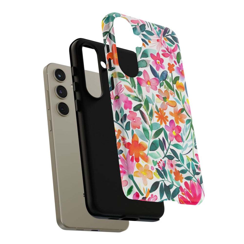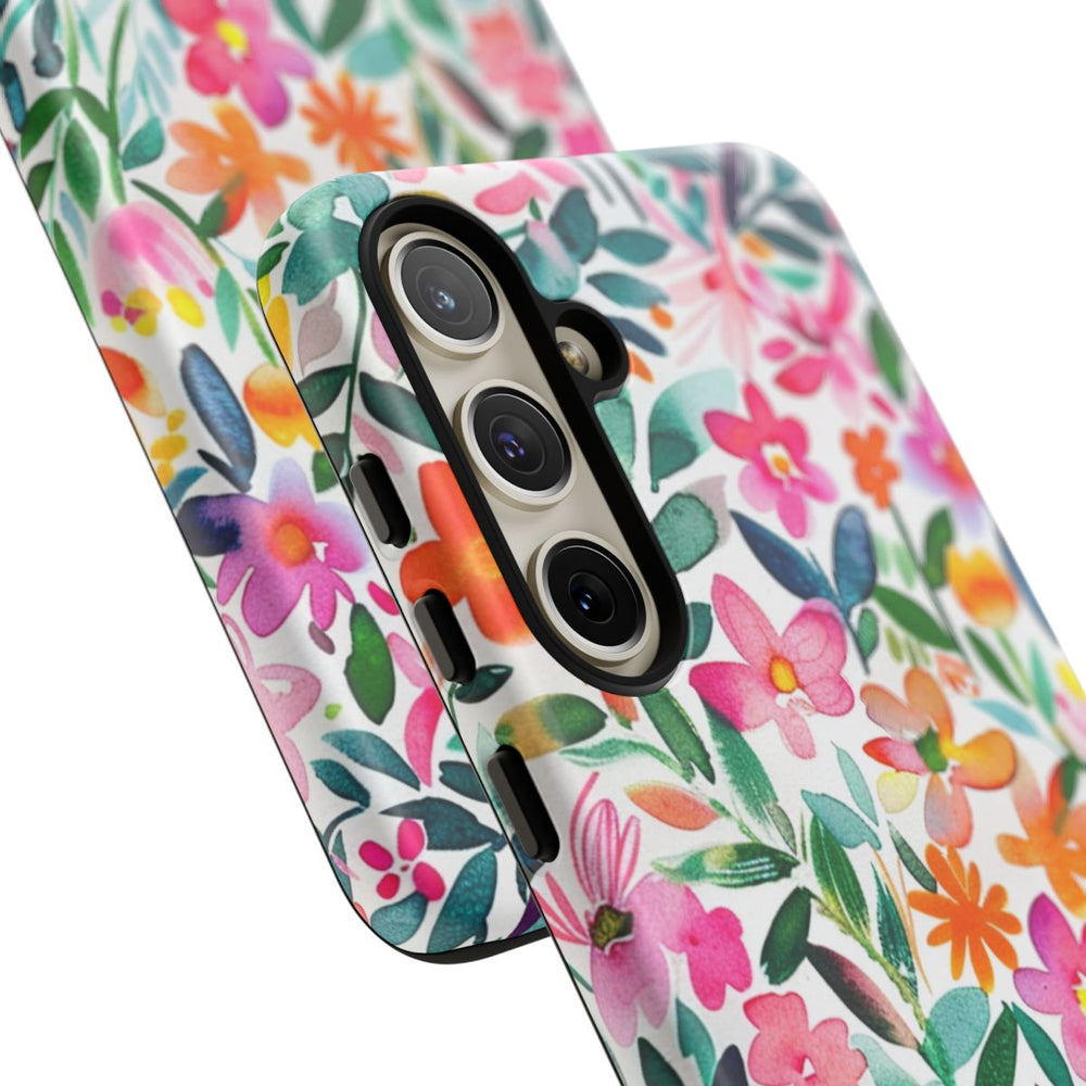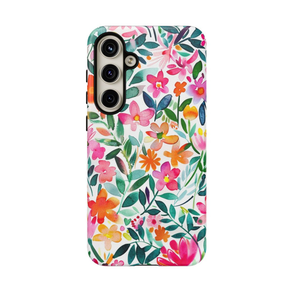 Dit telefoonhoesje is bedrukt met een levendig aquarel bloemenpatroon, bestaande uit diverse kleine bloemen en bladeren. De bloemen zijn geschilderd in heldere tinten roze, oranje, geel en koraal, gecombineerd met groene accenten. De zachte en vloeiende penseelstreken zorgen voor een speelse en frisse uitstraling. De witte achtergrond laat de kleuren extra opvallen. Het patroon is aangebracht op een stevige, matte hoes met dubbele laag van polycarbonaat en TPU, wat zorgt voor extra bescherming en ondersteuning van draadloos opladen.