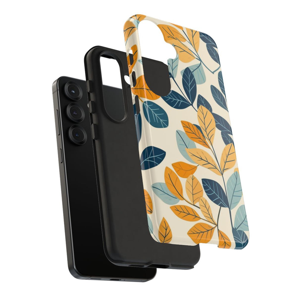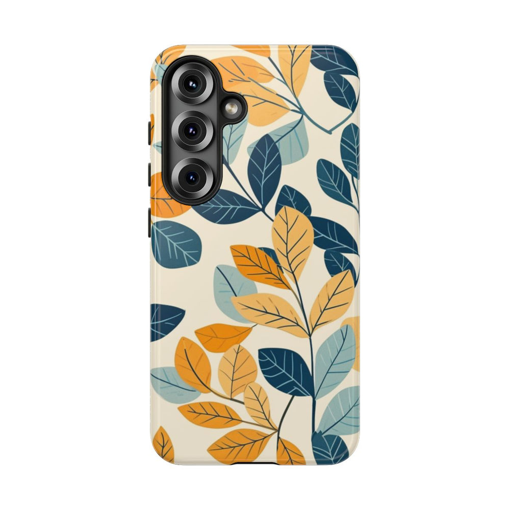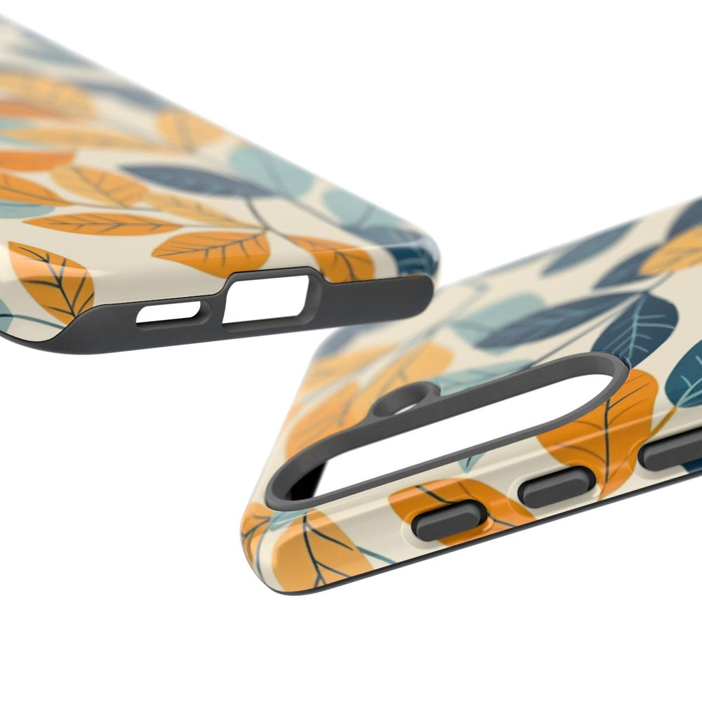 Dit telefoonhoesje heeft een herhalend patroon van gestileerde bladeren in tinten oranje, blauw en lichtblauw op een crèmekleurige achtergrond. De bladeren zijn voorzien van eenvoudige nerfdetails en liggen speels en overlappend naast elkaar voor een natuurlijke uitstraling. Het hoesje heeft een glanzende afwerking en bestaat uit twee lagen: een stevige buitenkant van polycarbonaat en een schokabsorberende TPU-binnenkant voor extra bescherming. Geschikt voor draadloos opladen en bestand tegen invloeden van buitenaf.