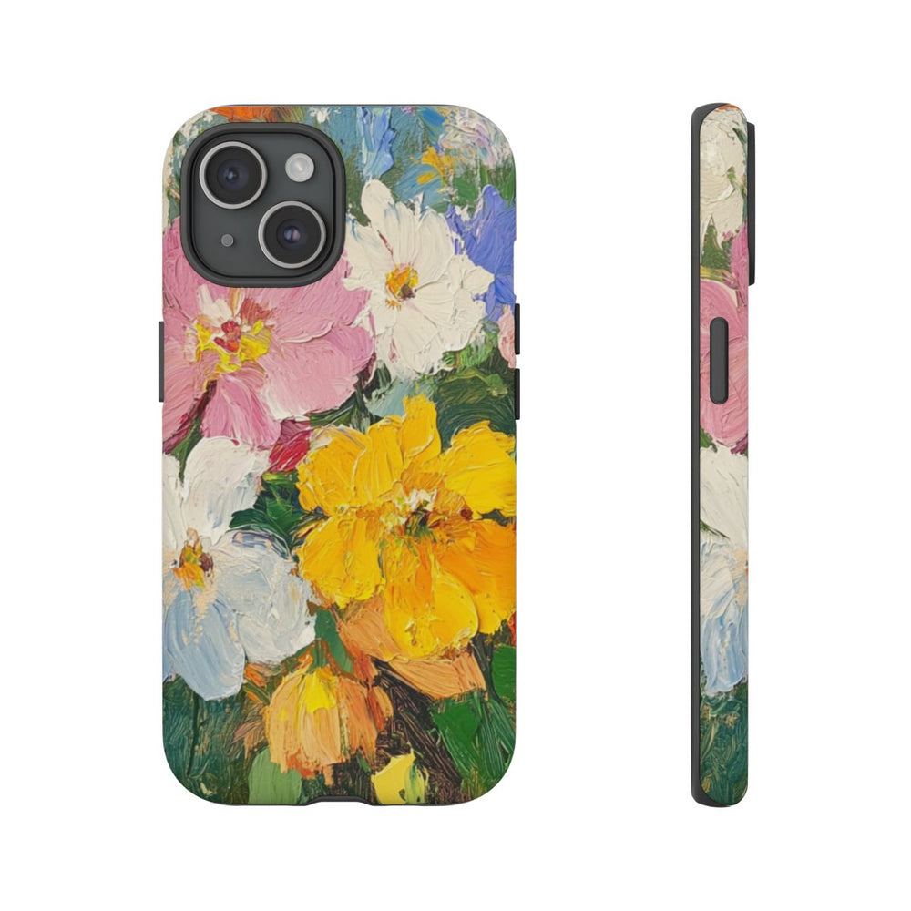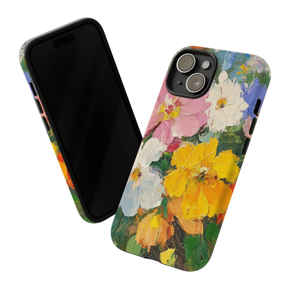 Dit hoesje is versierd met een levendige olieverfschildering van een bloemenboeket, geschilderd met dikke en voelbare penseelstreken. De bloemen zijn uitgevoerd in uiteenlopende kleuren zoals roze, wit, geel, oranje, paars en blauw, tegen een rustige achtergrond in groen- en blauwtinten. Het hoesje bestaat uit twee lagen: een stevige polycarbonaat buitenkant en een TPU-binnenzijde. Hierdoor is het hoesje mat, biedt het bescherming tegen weersinvloeden en is draadloos opladen mogelijk.