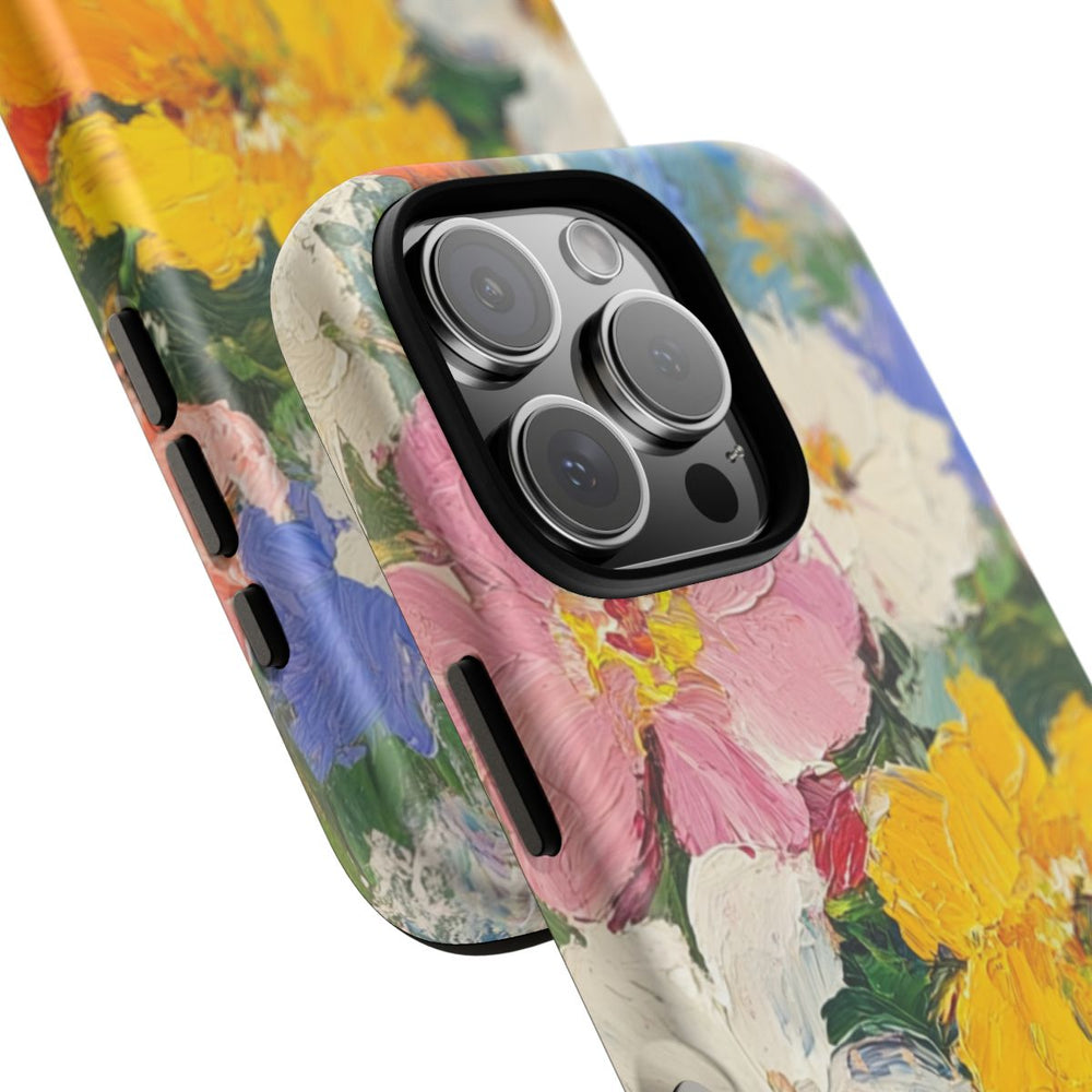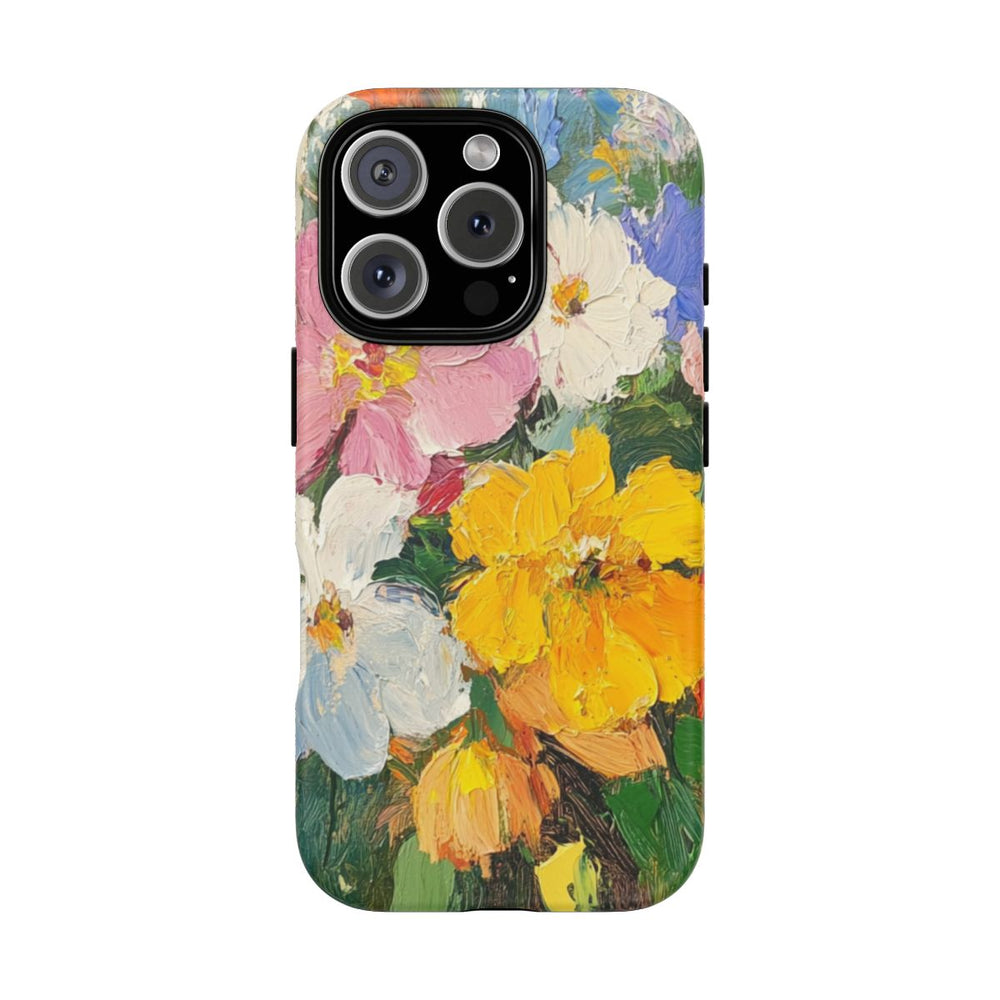 Dit ontwerp toont een levendig bloemenboeket, geschilderd in olieverf met dikke, zichtbare penseelstreken. De bloemen zijn uitgevoerd in heldere kleuren zoals roze, wit, geel, oranje en paars en komen mooi uit tegen een rustige achtergrond van blauw en groen. De afbeelding is gedrukt op een mat telefoonhoesje met een stevige polycarbonaat buitenkant en een TPU-binnenzijde. Het hoesje biedt dubbele bescherming en is geschikt voor draadloos opladen.