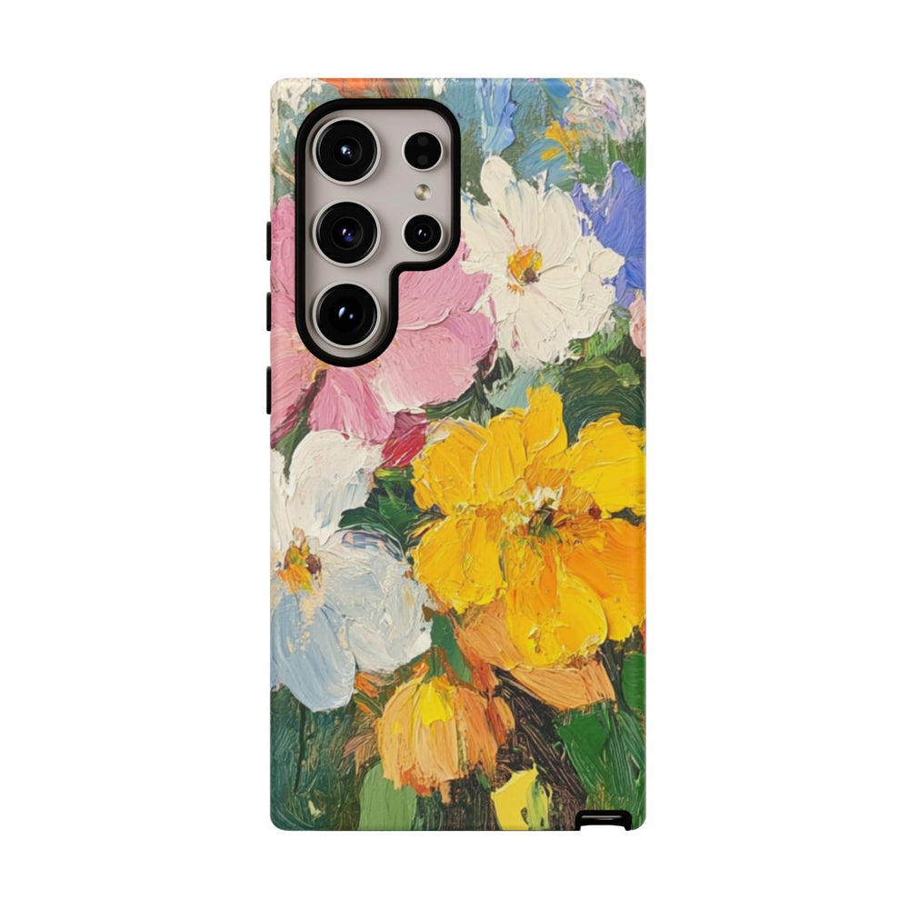 Dit hoesje is voorzien van een levendig olieverfschilderij van een bloemenboeket, met dikke, zichtbare penseelstreken. De bloemen bestaan uit grote bloesems in tinten roze, wit, geel, oranje en paars, tegen een rustige achtergrond in groen en blauw. De afbeelding is gedrukt op een matte, stevige hoes met dubbele laag van polycarbonaat en TPU, wat zorgt voor extra duurzaamheid en bescherming. Het hoesje ondersteunt draadloos opladen en is bestand tegen invloeden van buitenaf.
