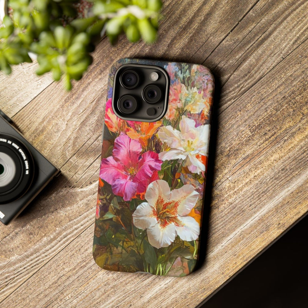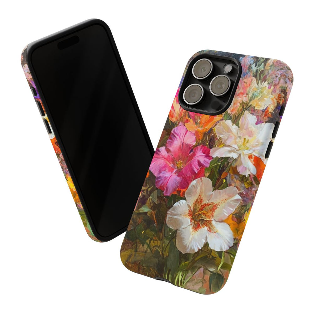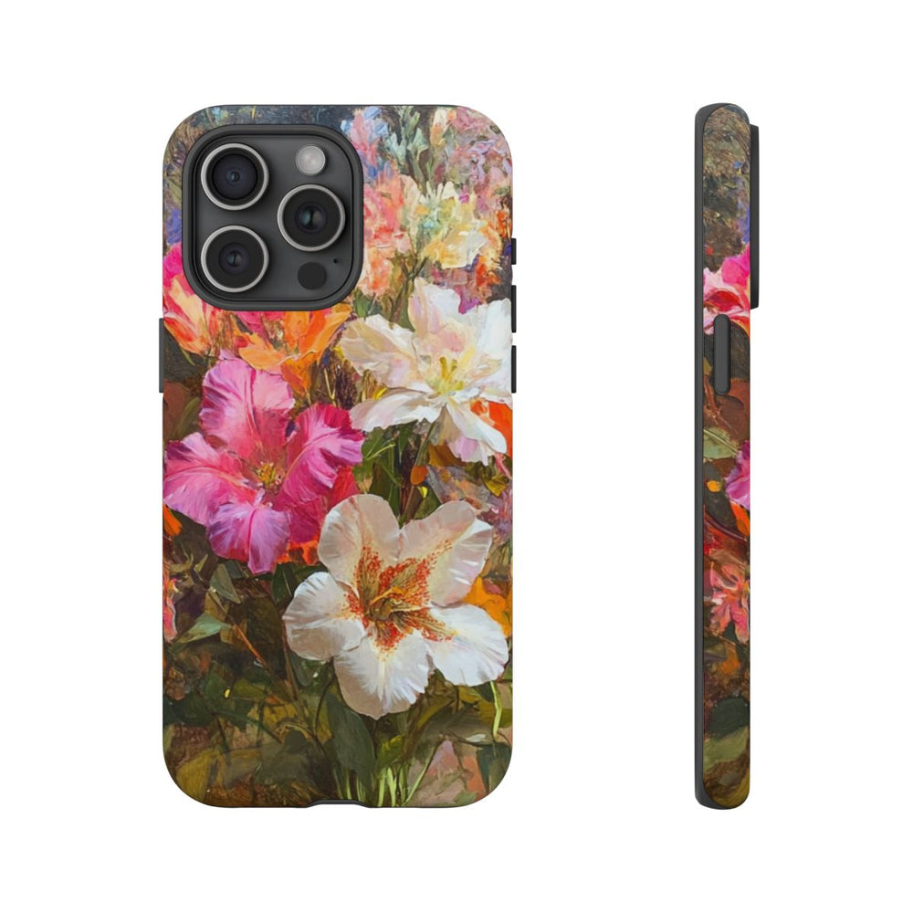 Dit ontwerp toont een levendig boeket bloemen, geschilderd met rijke en expressieve penseelstreken. De bloemen bestaan uit grote witte, roze, oranje en paarse bloesems met groene bladeren, afgezet tegen een donkere, getextureerde achtergrond. Het telefoonhoesje heeft een dubbele laag met een matte afwerking, bestaande uit een polycarbonaat buitenkant en een TPU binnenzijde, voor extra bescherming en geschikt voor draadloos opladen. Het kunstwerk geeft het hoesje een klassieke, bloemrijke uitstraling.