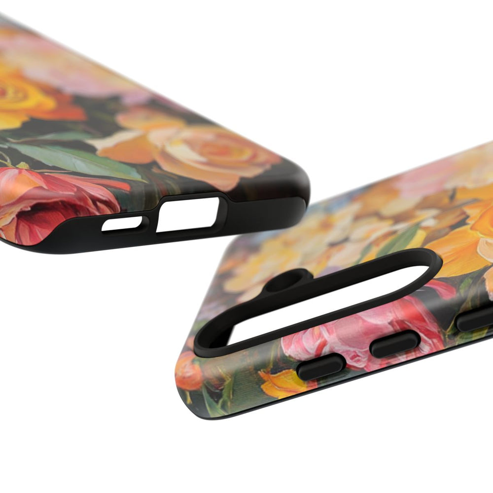 Dit telefoonhoesje is voorzien van een levendig bloemenboeket met verschillende bloemen in tinten geel, roze, oranje, crème en lichtblauw. De bloemen worden omringd door groene bladeren en komen prachtig naar voren tegen een donkere achtergrond, wat zorgt voor een krachtig contrast. De afbeelding is gedrukt op een mat hoesje met een stevige polycarbonaat buitenkant en een TPU binnenlaag voor optimale bescherming. Het hoesje ondersteunt draadloos opladen en is bestand tegen weersinvloeden.