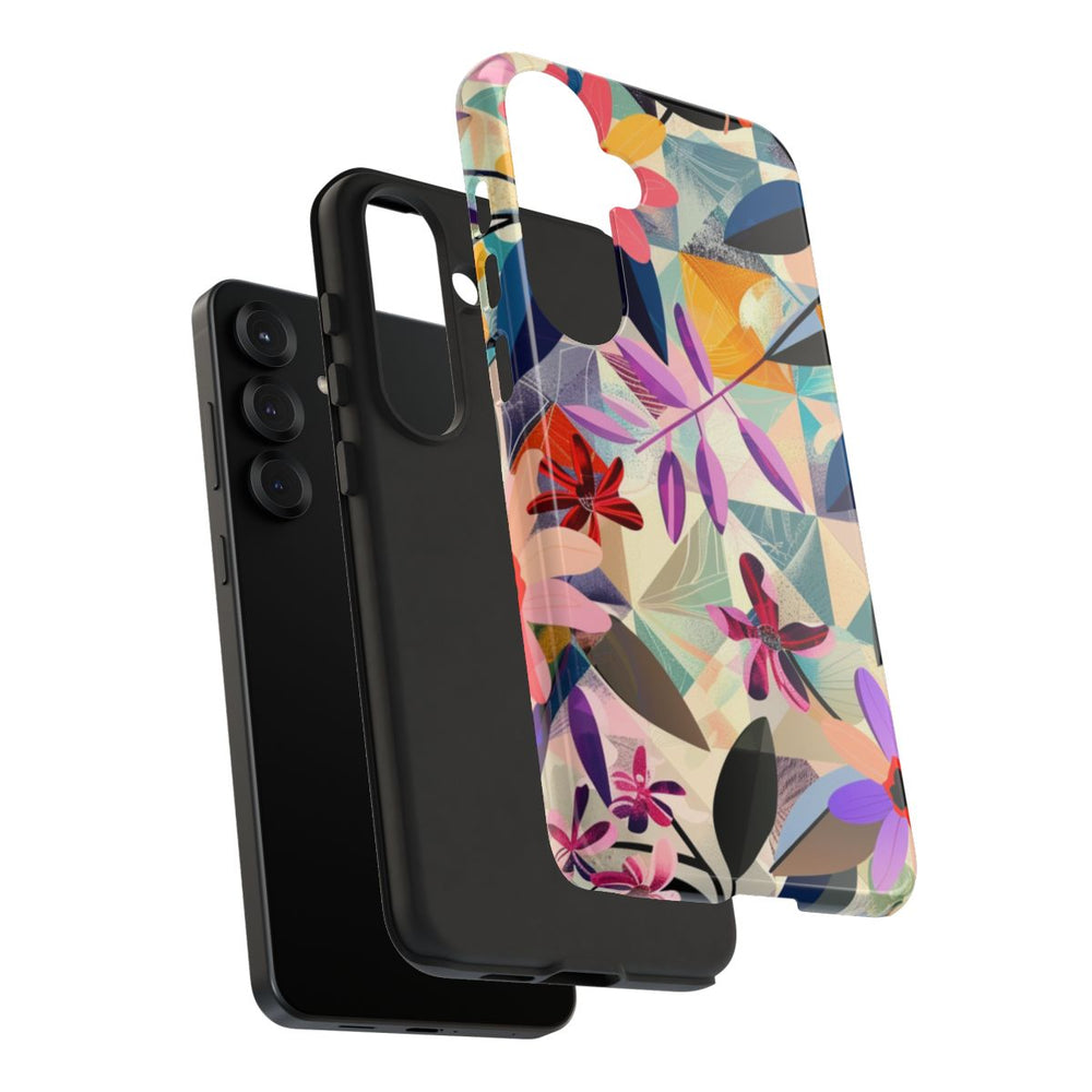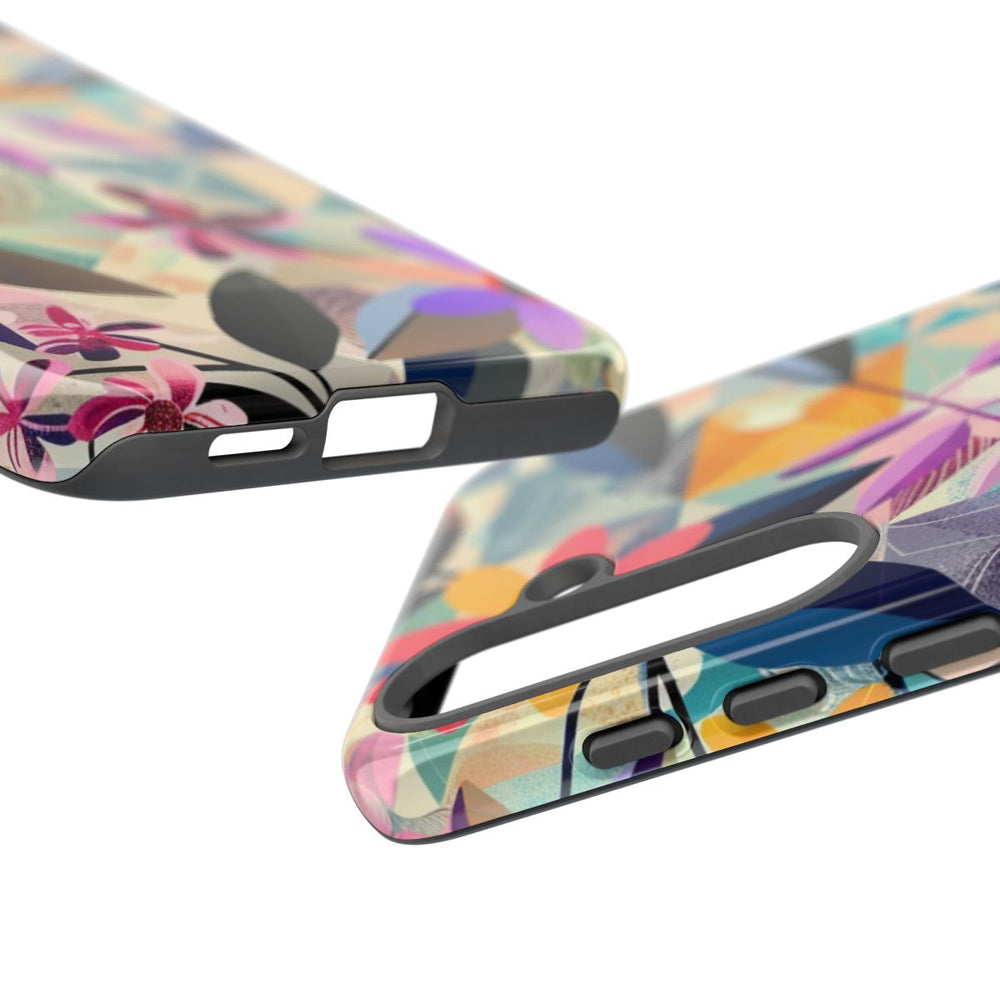 Dit hoesje heeft een levendig ontwerp met kleurrijke bloemen en bladeren op een geometrische achtergrond. De bloemen zijn uitgevoerd in roze, oranje, rood, paars en geel met zwarte harten, terwijl de bladeren donkerblauw, zwart en paars zijn. De achtergrond bestaat uit abstracte geometrische vormen in zachte tinten zoals beige, crème, blauw en oranje, wat zorgt voor een dynamisch en speels geheel. Het patroon is gedrukt op een glanzend, stevig hoesje van polycarbonaat en TPU, dat optimale bescherming biedt en geschikt is voor draadloos opladen.
