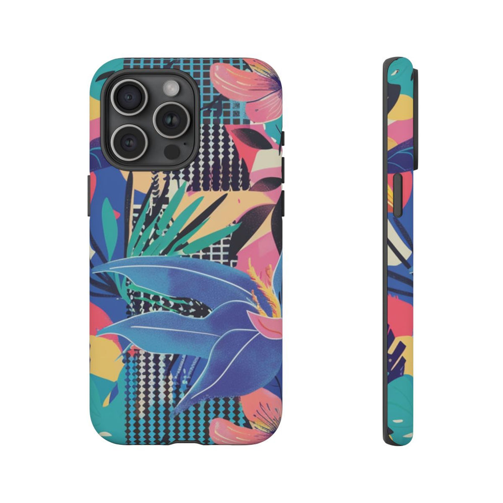 Dit ontwerp heeft een levendig bloemenpatroon met grote, gestileerde bloemen en bladeren in blauw, oranje en roze tinten. De bloemen worden omlijst door diverse abstracte vormen en rasterpatronen in blauw, geel en zwart. De achtergrond bestaat uit zachte crème- en rozenuances, wat zorgt voor een speels en dynamisch geheel. Het patroon is bedrukt op een mat telefoonhoesje met een stevige polycarbonaat buitenkant en TPU-binnenzijde, waardoor het hoesje optimale bescherming biedt en geschikt is voor draadloos opladen.