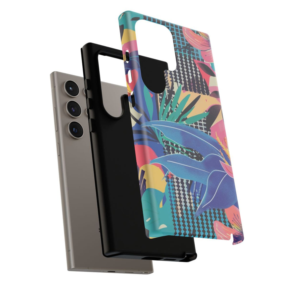 Dit ontwerp heeft een levendig bloemenpatroon met grote, gestileerde bloemen en bladeren in blauw, oranje en roze tinten. De bloemen worden omlijst door diverse abstracte vormen en rasterpatronen in blauw, geel en zwart. De achtergrond bestaat uit zachte crème- en rozenuances, wat zorgt voor een speels en dynamisch geheel. Het patroon is bedrukt op een mat telefoonhoesje met een stevige polycarbonaat buitenkant en TPU-binnenzijde, waardoor het hoesje optimale bescherming biedt en geschikt is voor draadloos opladen.