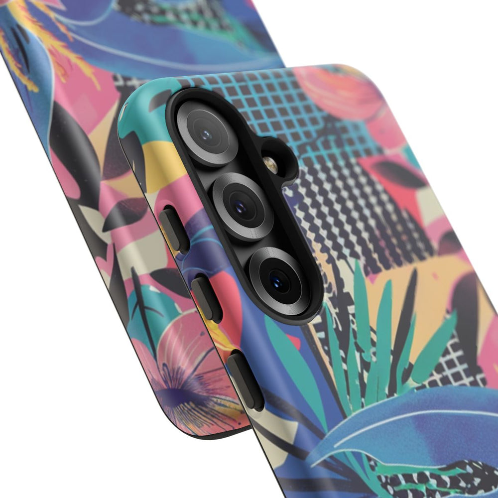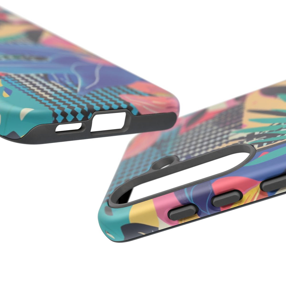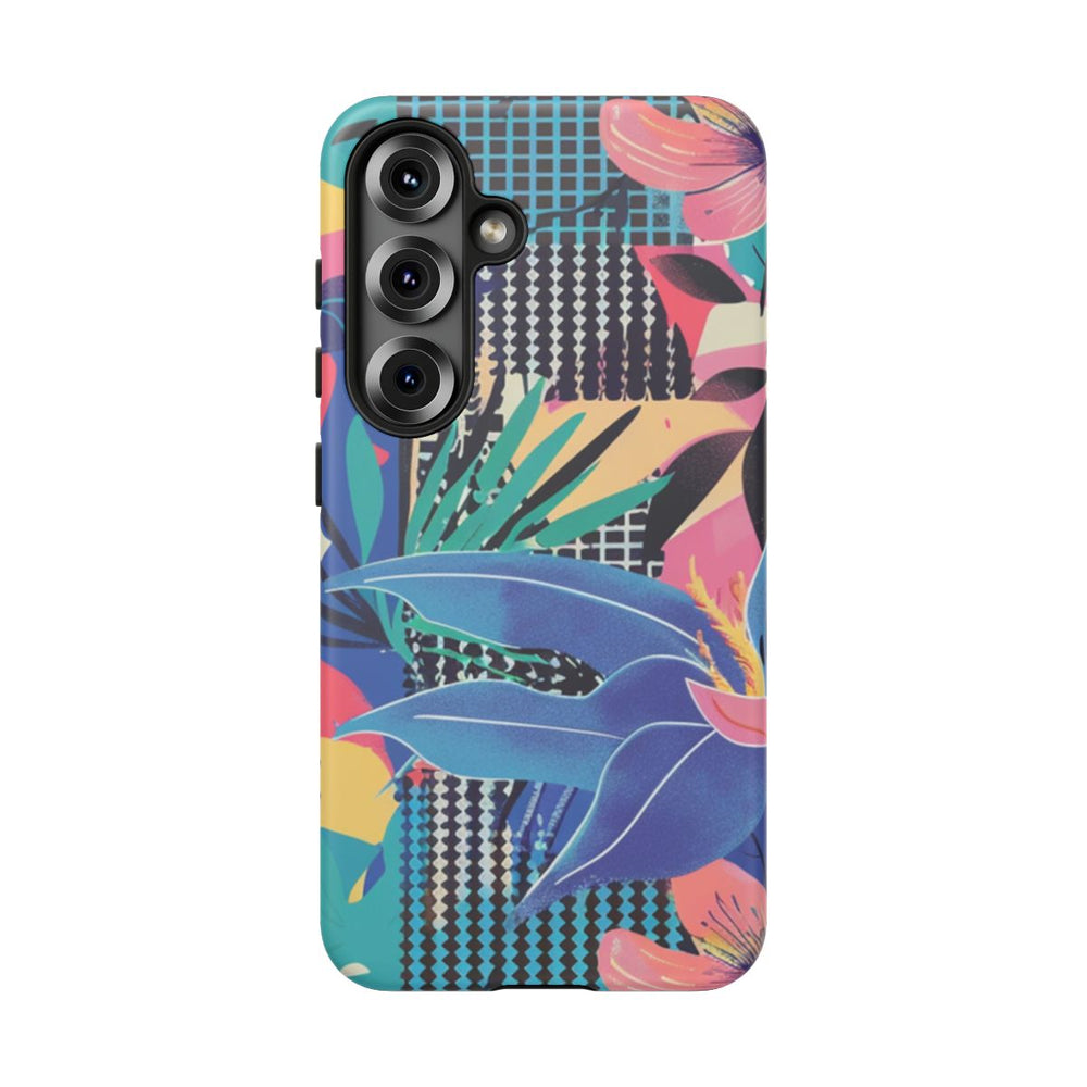 Dit ontwerp heeft een levendig bloemenpatroon met grote, gestileerde bloemen en bladeren in blauw, oranje en roze tinten. De bloemen worden omlijst door diverse abstracte vormen en rasterpatronen in blauw, geel en zwart. De achtergrond bestaat uit zachte crème- en rozenuances, wat zorgt voor een speels en dynamisch geheel. Het patroon is bedrukt op een mat telefoonhoesje met een stevige polycarbonaat buitenkant en TPU-binnenzijde, waardoor het hoesje optimale bescherming biedt en geschikt is voor draadloos opladen.