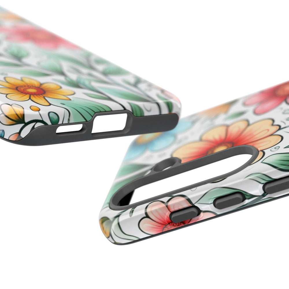 Dit ontwerp heeft een levendig bloemenpatroon met diverse bloemen in blauw, roze, geel en oranje tinten. De bloemen zijn gedetailleerd getekend met verfijnde bloemblaadjes en hartjes, omringd door groene bladeren en kleine knopjes. De illustratie staat op een witte achtergrond, wat zorgt voor een frisse en heldere uitstraling. Het hoesje is glanzend en stevig, met een buitenkant van polycarbonaat en een binnenlaag van TPU voor dubbele bescherming. Ondersteunt draadloos opladen. De stijl is zacht en cartoonesk met fijne contouren.