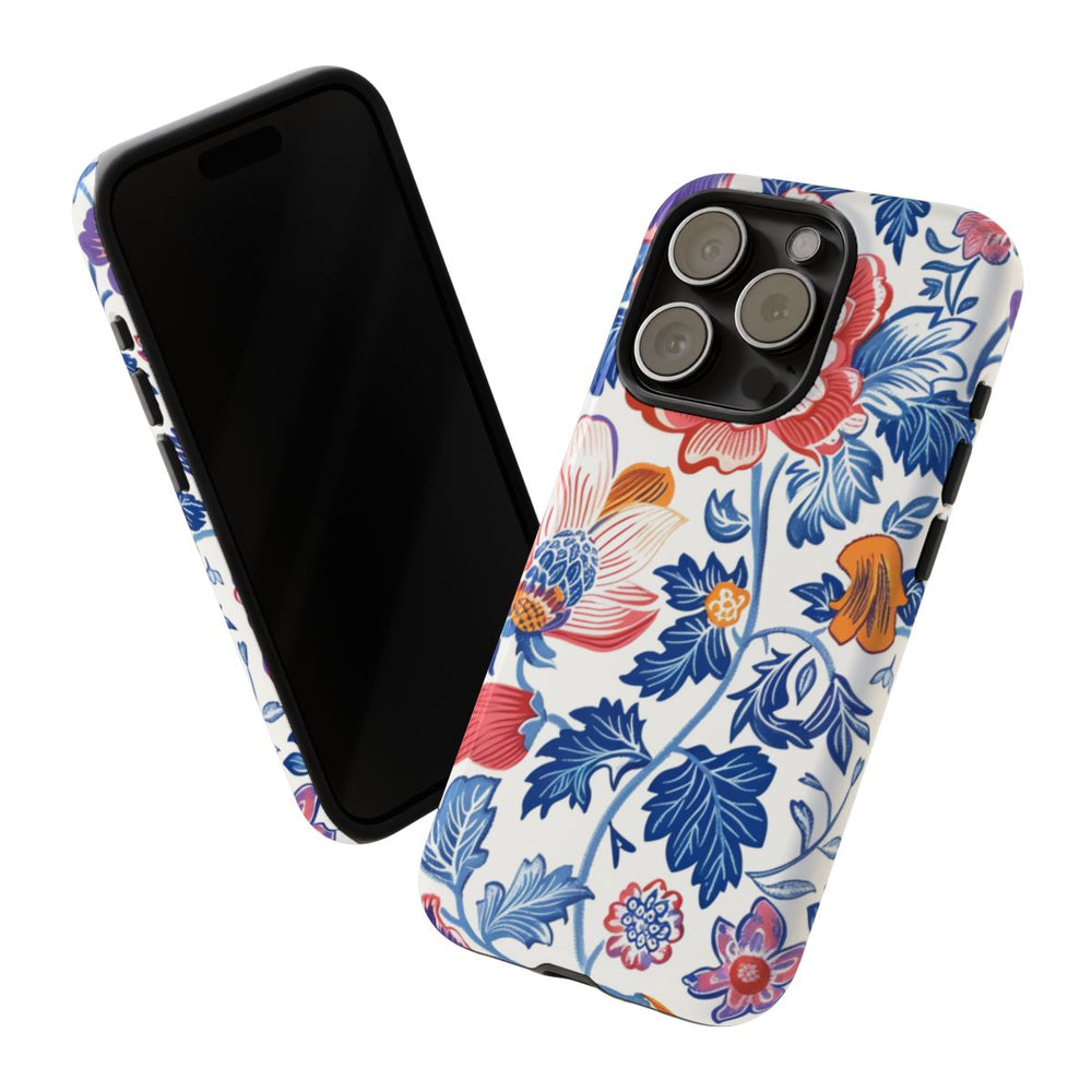Dit hoesje heeft een levendig bloemenpatroon met grote, gedetailleerde bloemen in paarse, oranje, roze en rode tinten. De bloemen worden omringd door diverse blauwe bladeren en stelen op een witte achtergrond. Het ontwerp is fris en kleurrijk en geeft je telefoon een artistieke uitstraling. Het hoesje heeft een glanzende afwerking en bestaat uit een dubbele laag van polycarbonaat en TPU voor extra stevigheid en bescherming. Geschikt voor draadloos opladen en bestand tegen invloeden van buitenaf.