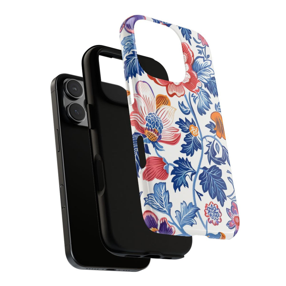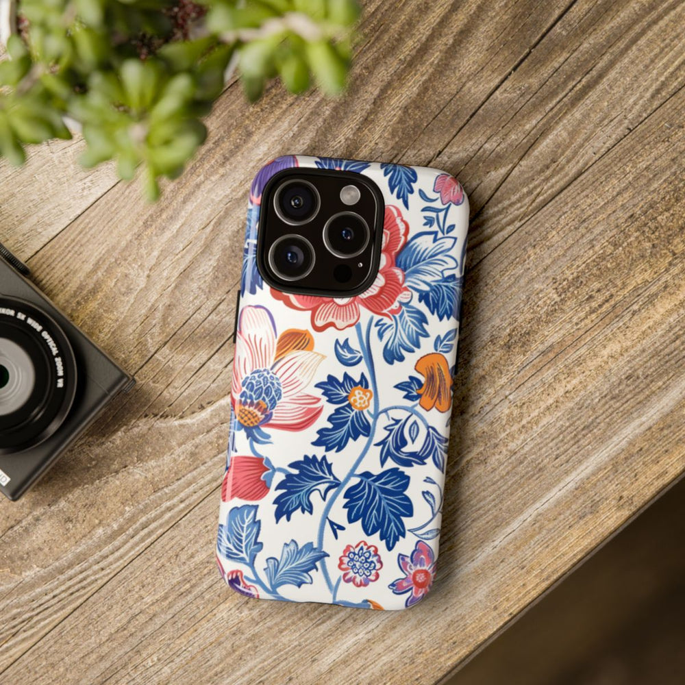 Dit hoesje heeft een levendig bloemenpatroon met grote, gedetailleerde bloemen in paarse, oranje, roze en rode tinten. De bloemen worden omringd door diverse blauwe bladeren en stelen op een witte achtergrond. Het ontwerp is fris en kleurrijk en geeft je telefoon een artistieke uitstraling. Het hoesje heeft een glanzende afwerking en bestaat uit een dubbele laag van polycarbonaat en TPU voor extra stevigheid en bescherming. Geschikt voor draadloos opladen en bestand tegen invloeden van buitenaf.