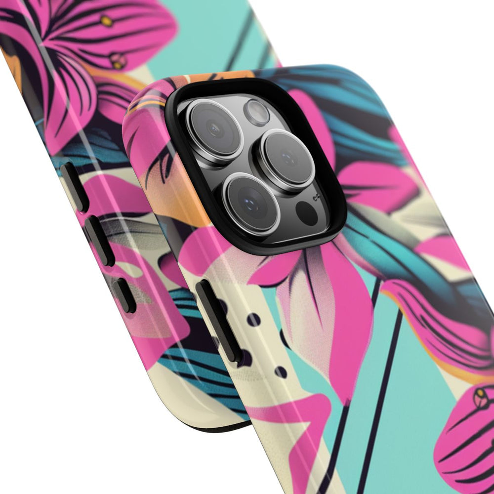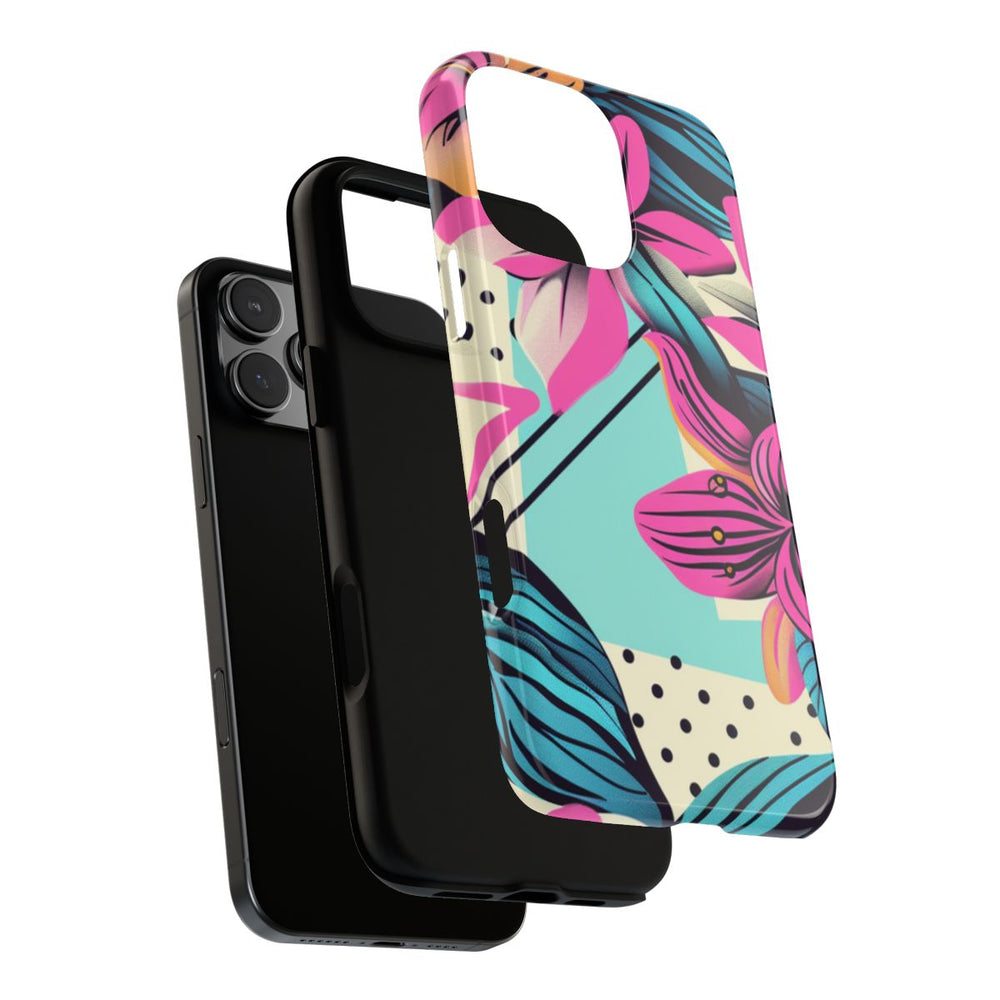Dit hoesje is bedrukt met een levendig bloemenpatroon, bestaande uit grote roze en oranje bloemen, omlijst door blauwgroene en blauwe bladeren. De zachte beige achtergrond is versierd met zwarte stippen en geometrische vormen in lichtblauw en zwart, wat zorgt voor een dynamische en moderne uitstraling. Het opvallende ontwerp combineert natuurlijke bloemenelementen met abstracte vormen. Het hoesje is gemaakt van polycarbonaat en TPU en biedt dubbele laag bescherming en ondersteuning voor draadloos opladen.