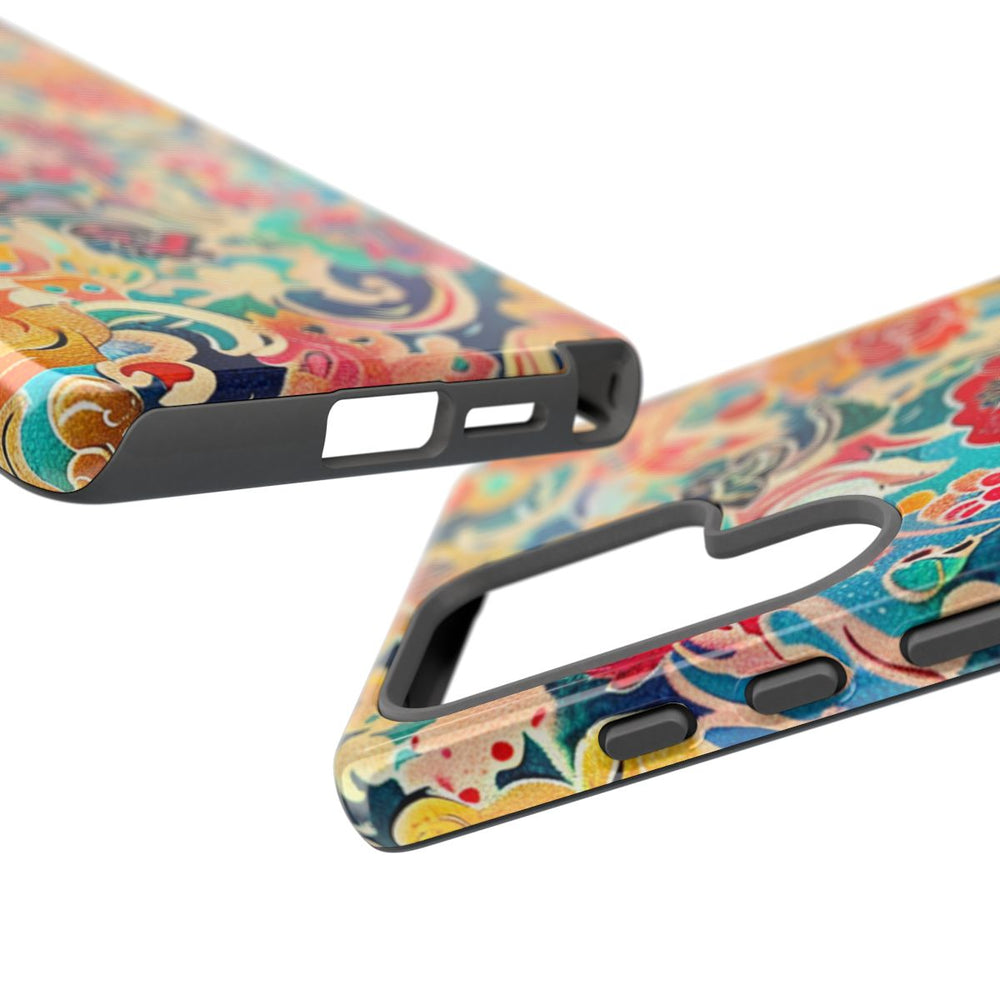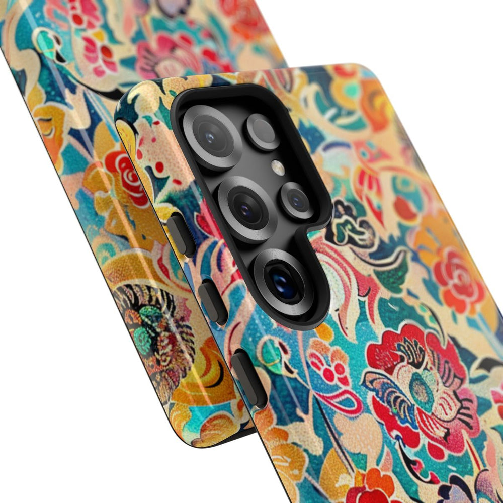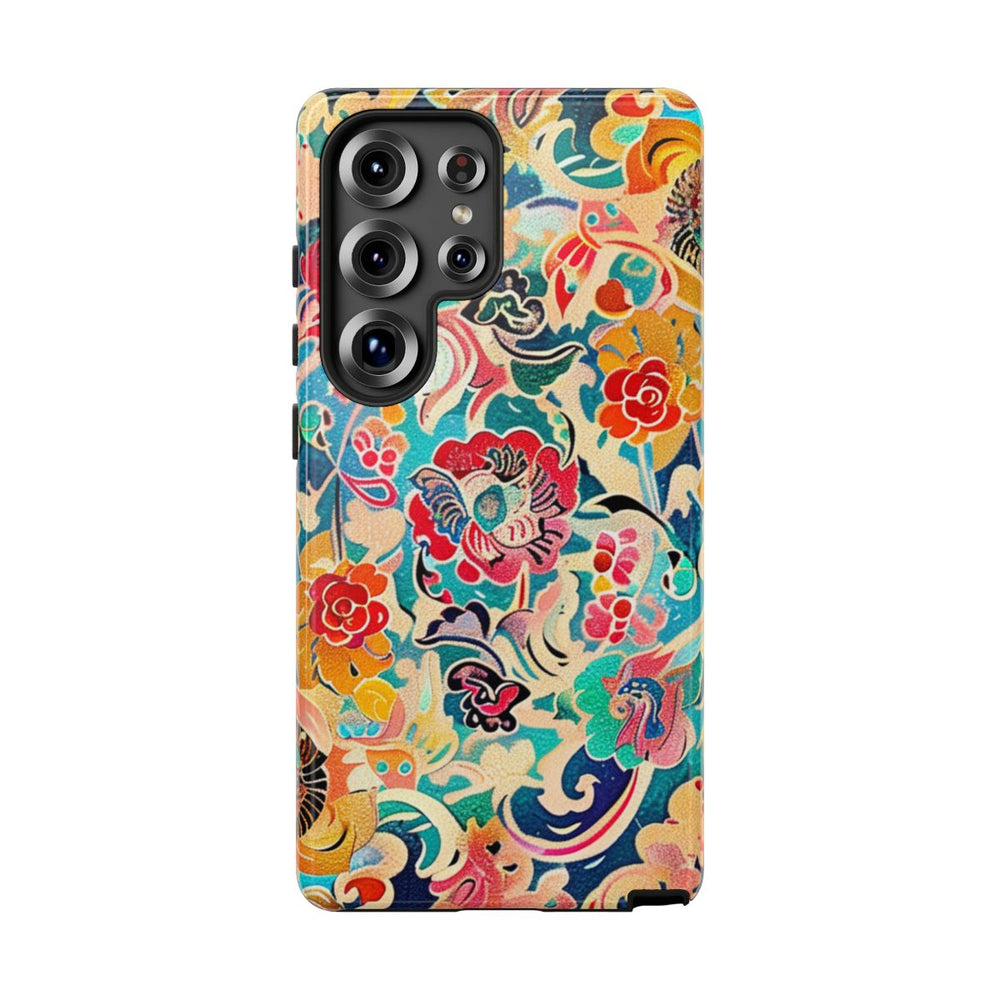 Dit telefoonhoesje heeft een levendig en gedetailleerd bloemenpatroon met diverse bloemen en sierlijke vormen in tinten oranje, rood, roze, geel en blauw. De achtergrond is overwegend blauw, met lichte en donkere schakeringen die zorgen voor een dynamische en speelse uitstraling. Het patroon is rijk aan details en heeft een decoratieve stijl. Het hoesje heeft een glanzende afwerking en bestaat uit twee lagen voor extra stevigheid en bescherming. Geschikt voor draadloos opladen.