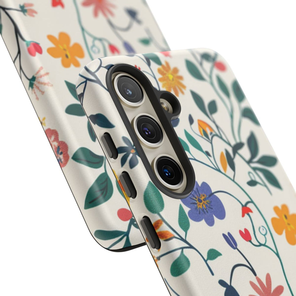 Dit ontwerp heeft een levendig bloemenpatroon met diverse kleurrijke bloemen en groene klimop die sierlijk door elkaar heen lopen. De bloemen zijn uitgevoerd in tinten paars, geel, roze, rood en oranje, op een lichtbeige achtergrond. De groene bladeren en stelen geven een natuurlijke uitstraling en zorgen voor een verfijnd en vrolijk botanisch geheel. Het patroon is bedrukt op een mat hoesje met een stevige polycarbonaat buitenkant en een TPU binnenzijde, waardoor het hoesje optimale bescherming biedt en geschikt is voor draadloos opladen.